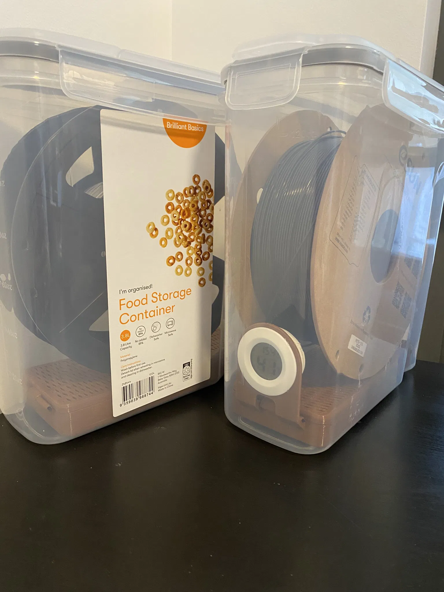 Hộp chống ẩm được thiết kế riêng cho hũ đựng ngũ cốc Big W dung tích 3.8L, đặt gọn gàng bên dưới cuộn dây in 3D. Sản phẩm này giúp bảo quản sợi filament khỏi hơi ẩm, đảm bảo chất lượng bản in tốt nhất. Bạn chỉ cần thêm gel hút ẩm và ẩm kế là dùng được ngay.