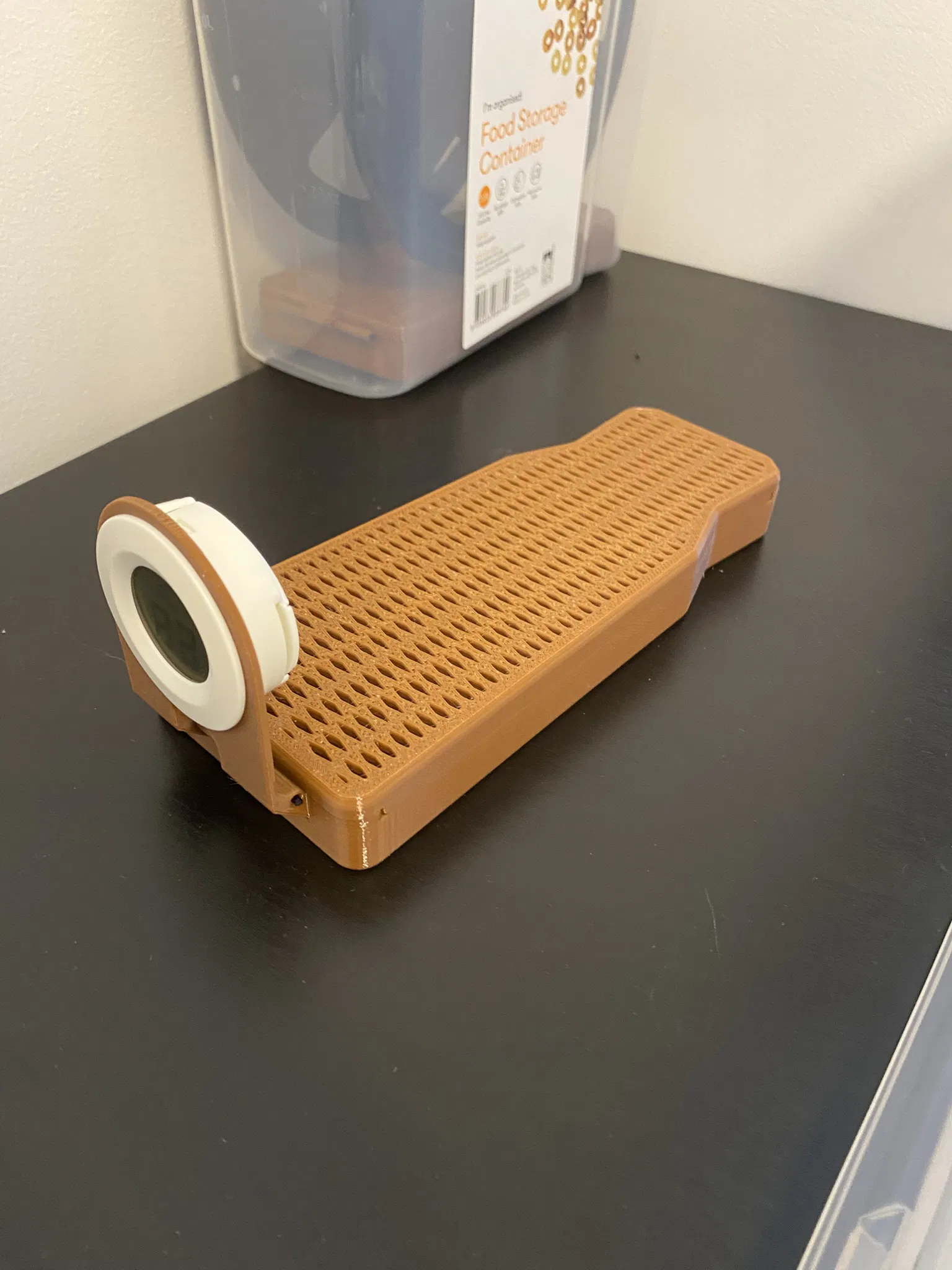 Mình in bằng PETG, chắc vật liệu nào cũng ổn thôi. Thiết kế để in không cần hỗ trợ. Không cần vít hay bộ phận nào khác ngoài gel hút ẩm và ẩm kế.