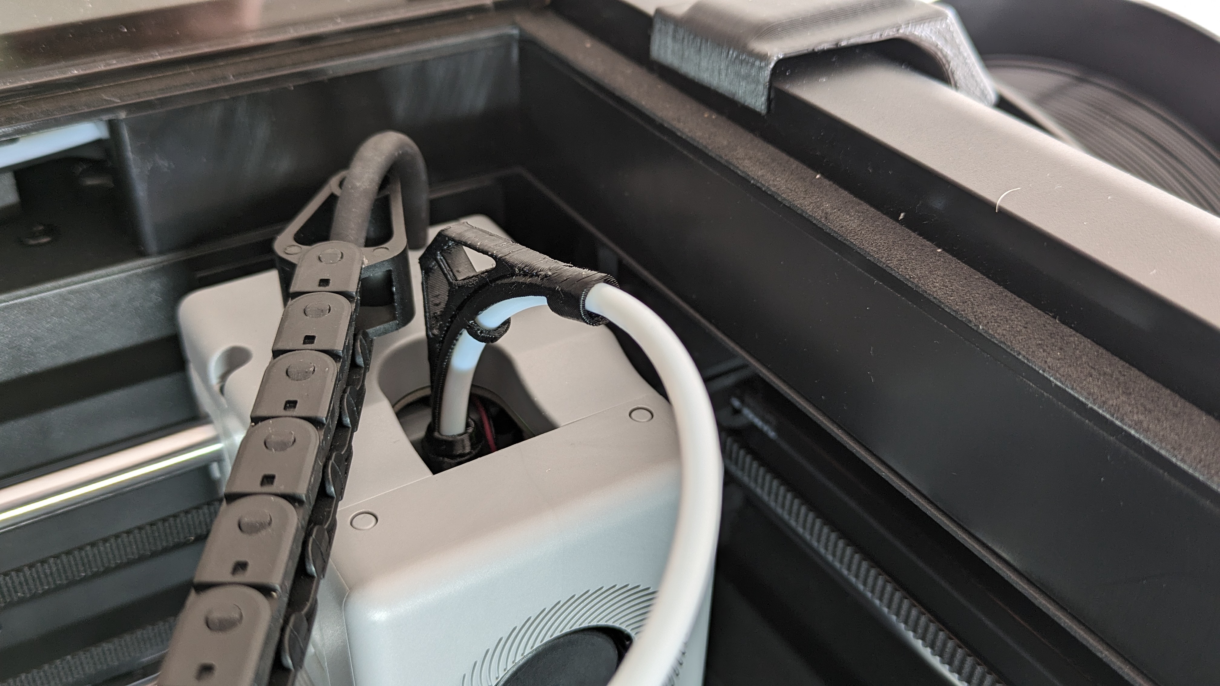 Bộ dẫn ống đùn cho Flashforge Adventurer 5m Pro để tránh trầy xước bên trong nắp. Phần dưới được làm mềm dẻo để đi theo ống đùn theo mọi hướng, đồng thời giữ nó hơi cố định.