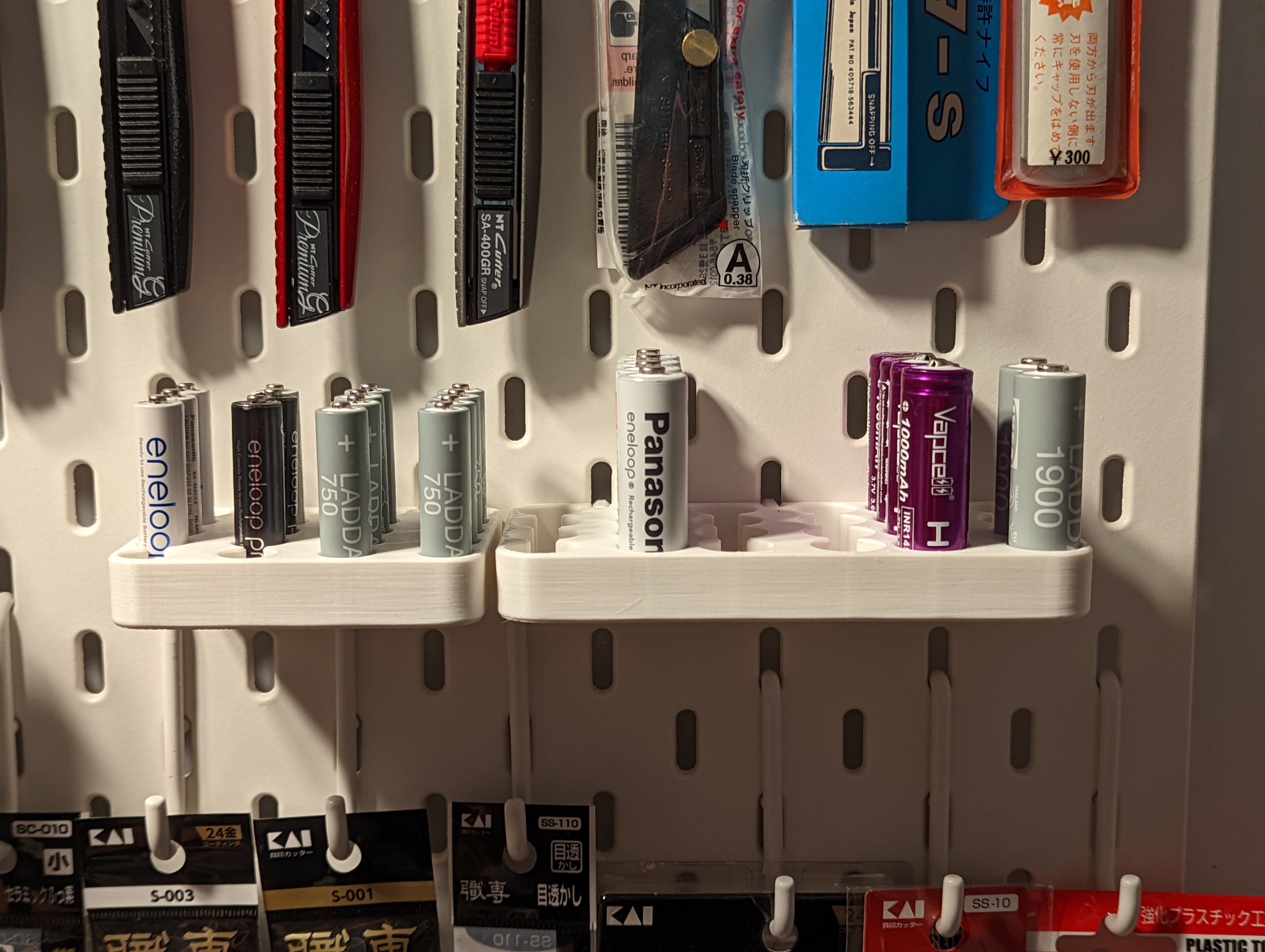 Tui có làm cái khay pin cho bảng pegboard IKEA SKÅDIS, có bản mới ép rời cái móc cho chắc chắn hơn. Bản này tối ưu cho đầu phun 0.4 mm, xài được cho pin AA, AAA và pin 18650 luôn đó. Vừa để đồ gọn gàng, vừa trang trí cho cái bảng pegboard thêm xinh.