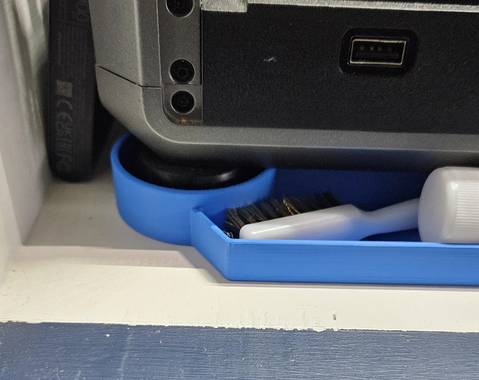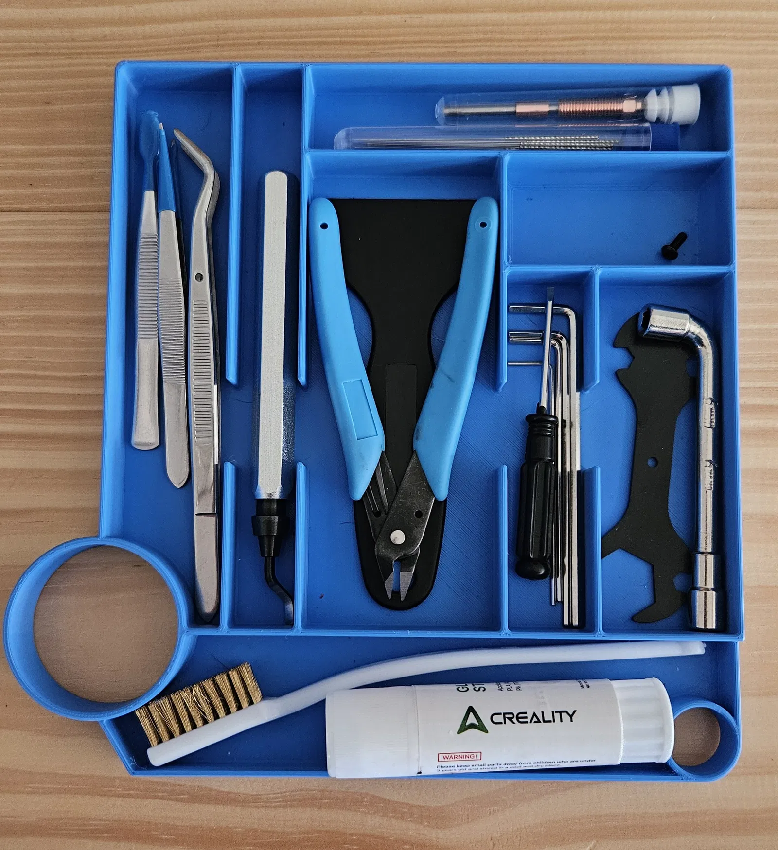 Cái khay đựng đồ nghề này đặt vừa khít phía dưới máy in dòng K1, nó được giữ cố định quanh chân máy phía trước bên trái. Bên trong có các ô nhỏ để đựng bộ đồ nghề của Creality, keo dán, đầu phun, ốc vít và nhiều dụng cụ khác.