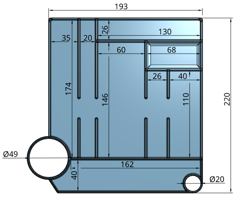Khay đựng đồ nghề dáng thấp, đặt vừa khít dưới máy in Creality K1, K1C và K1SE. Có các ngăn riêng cho bộ đồ nghề, keo, đầu phun, ốc vít và các dụng cụ khác. In bằng PLA, không cần cài đặt phức tạp.