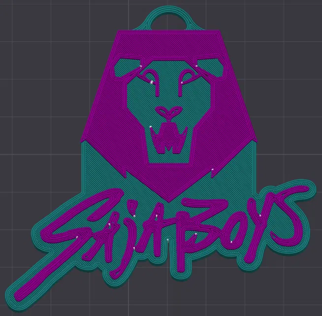 Logo Saja Boys kèm tên ban nhạc theo phong cách mặt dây chuyền phụ kiện cho móc khóa. Móc khóa này được remix từ logo sư tử của Faxu, thêm tên ban nhạc và in bằng PLA.