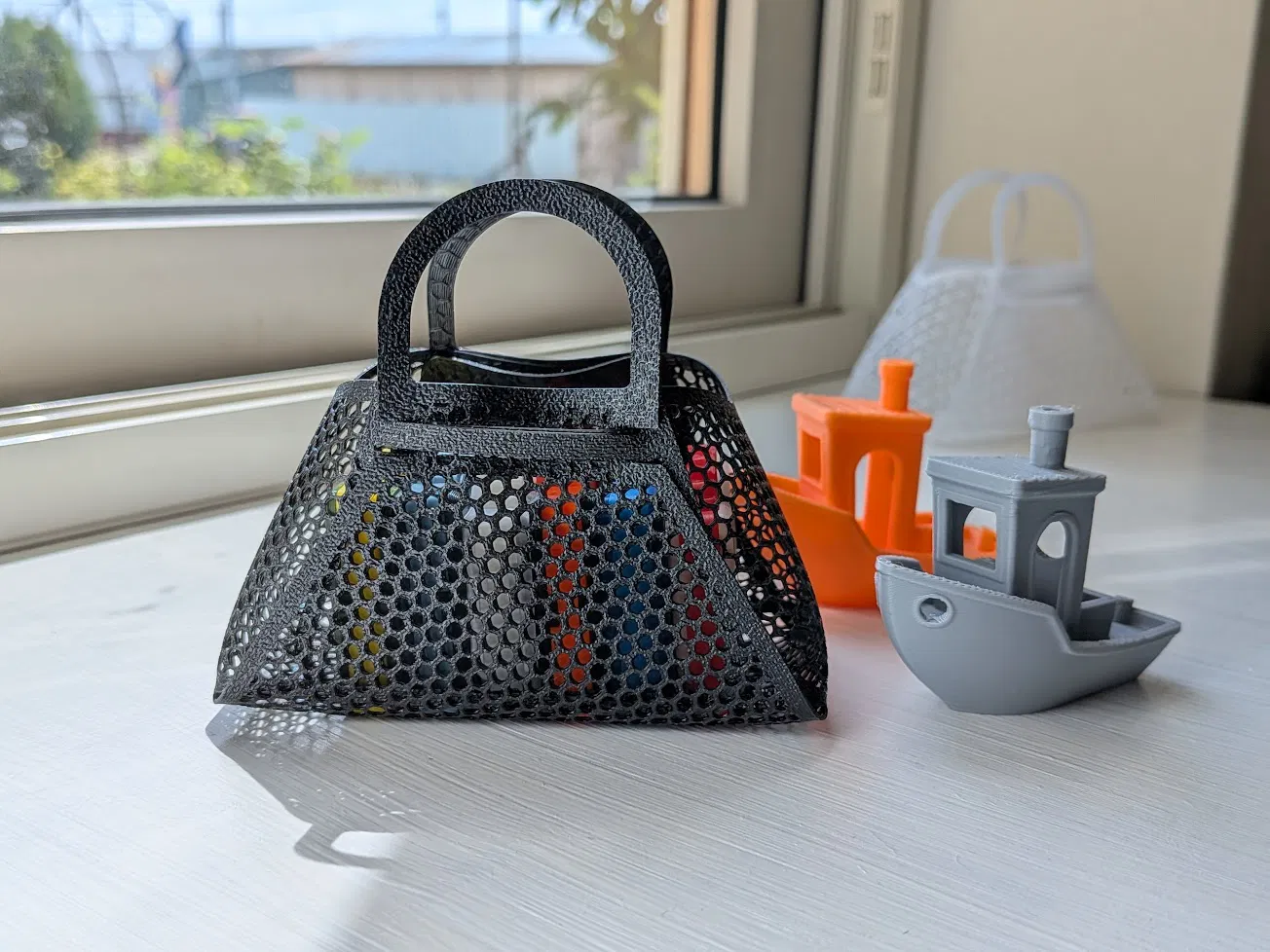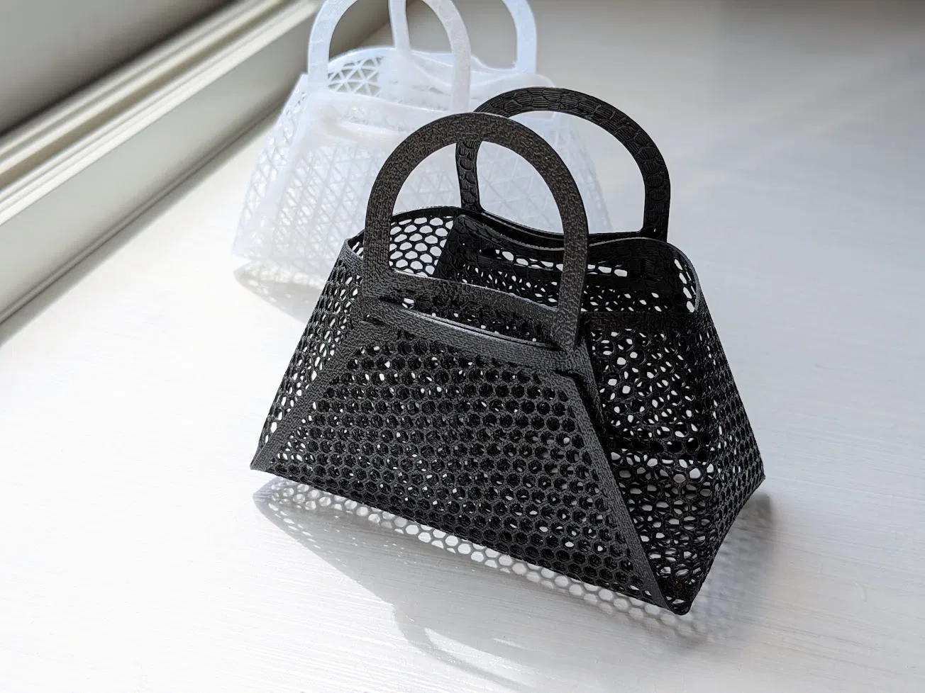 Đây là một chiếc túi tote 100% chức năng, tận dụng sự linh hoạt độc đáo của sợi TPU. Bằng cách đặt lớp trên cùng và lớp dưới cùng về 0, nó trở thành một chiếc túi lưới sử dụng mật độ ruột (infill). Bạn có thể tùy chỉnh theo ý thích bằng cách thay đổi kiểu dáng và mật độ ruột.