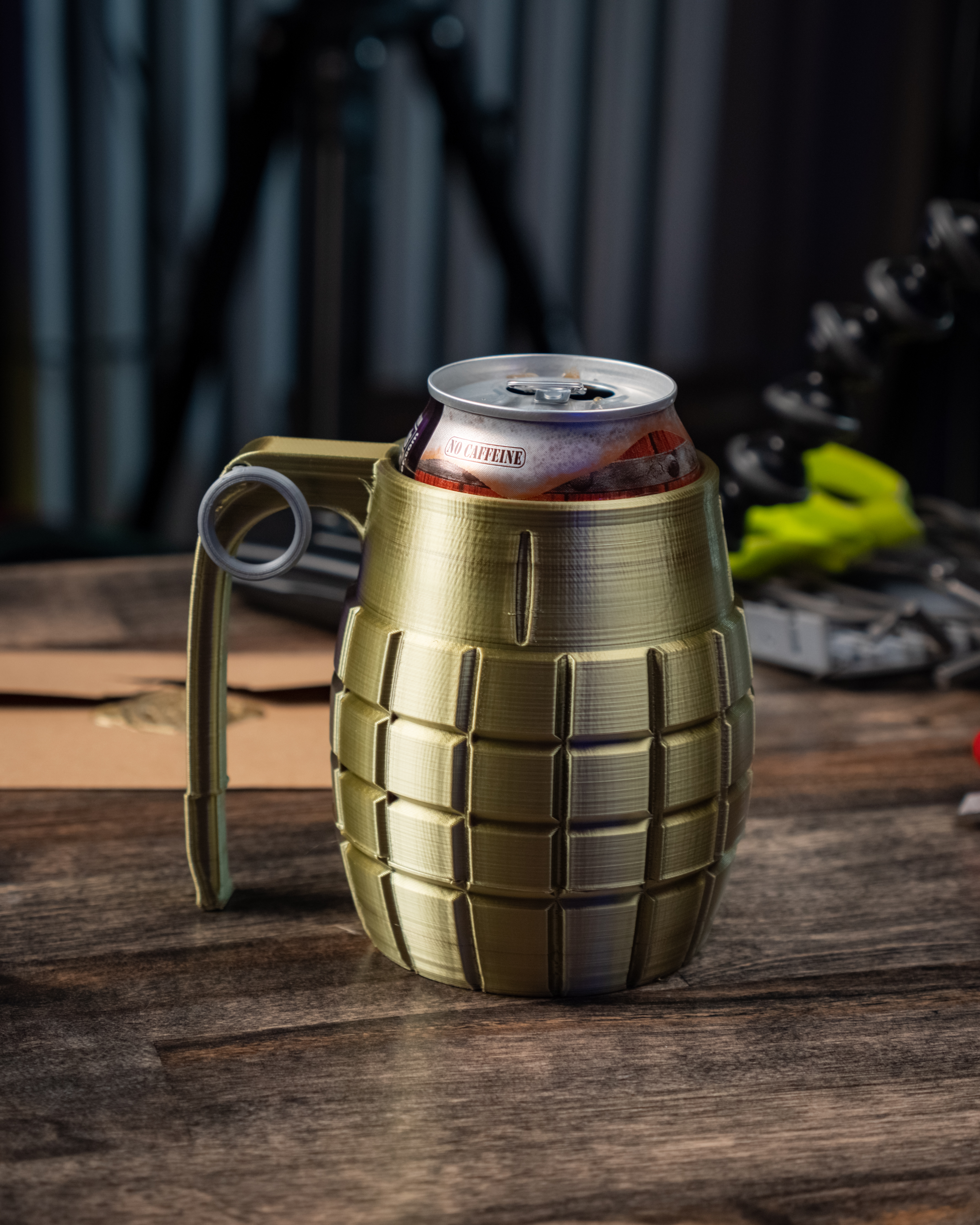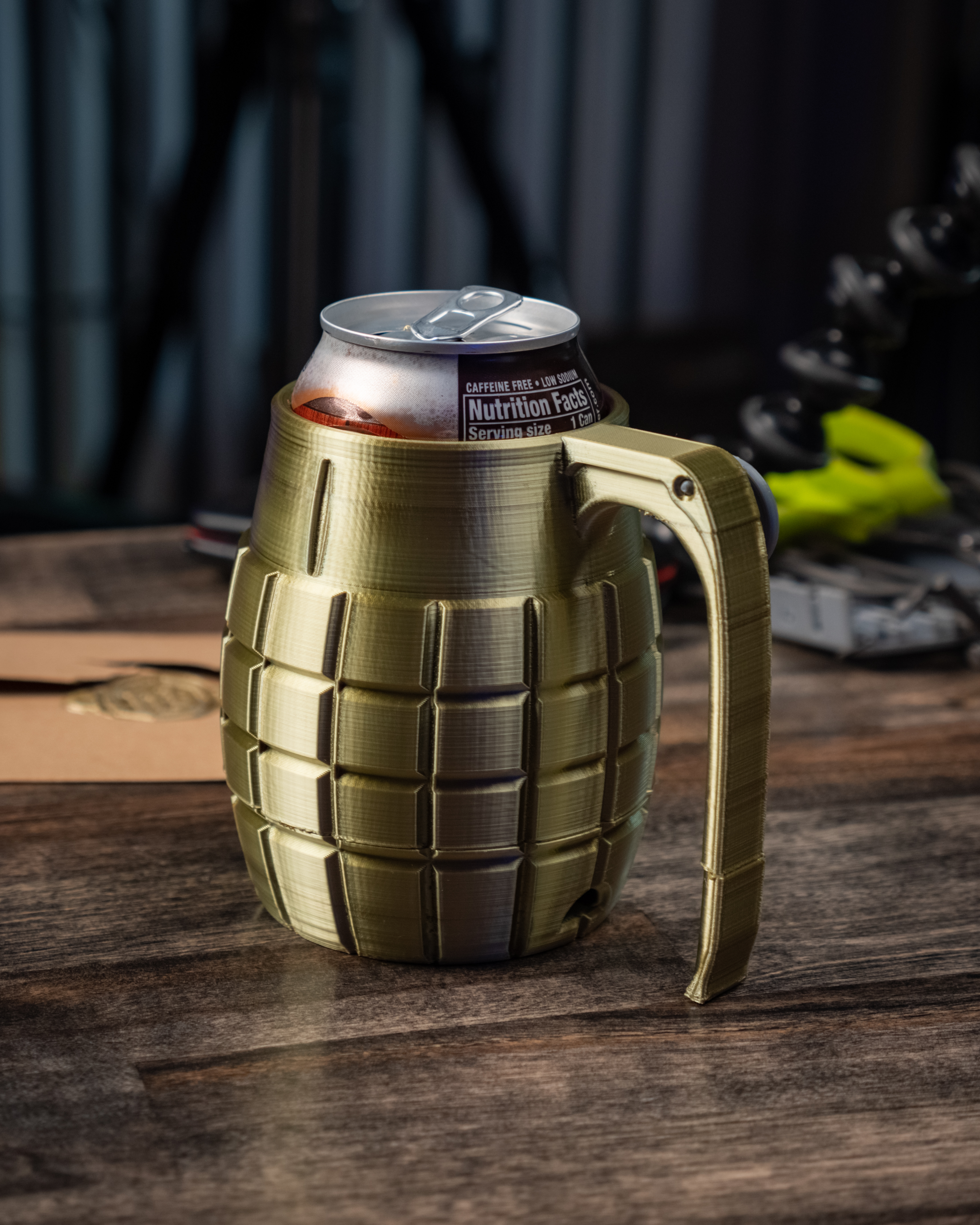 Cốc giữ lon "Can'D Grenade" 12oz - phiên bản gốc! Giúp giữ đồ uống mát lâu hơn, với thiết kế độc đáo hình lựu đạn. Cập nhật 2022 với cán dày hơn, lỗ thoát khí và giảm nhô ra. Bao gồm nhiều tùy chọn file và thông số in chi tiết. Chia sẻ dưới giấy phép Creative Commons.