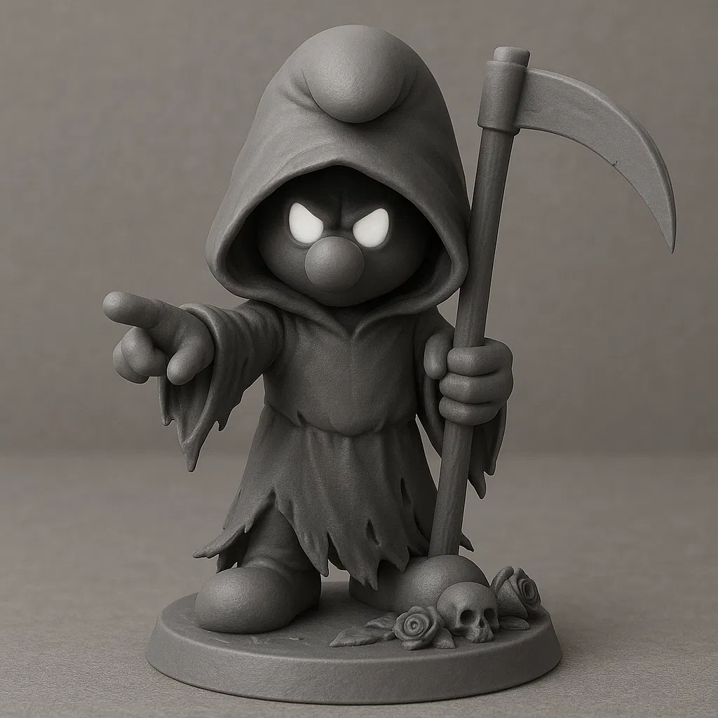 Mô hình "Tí Nị Thần Chết" độc đáo, kết hợp Tí Nị và Thần Chết. Nhân vật đứng trên bệ trang trí, khoác áo choàng rách, tay cầm lưỡi hái. Phù hợp in FDM/PLA, kích thước 100mm. Thích hợp cho người sưu tập, trang trí Halloween.