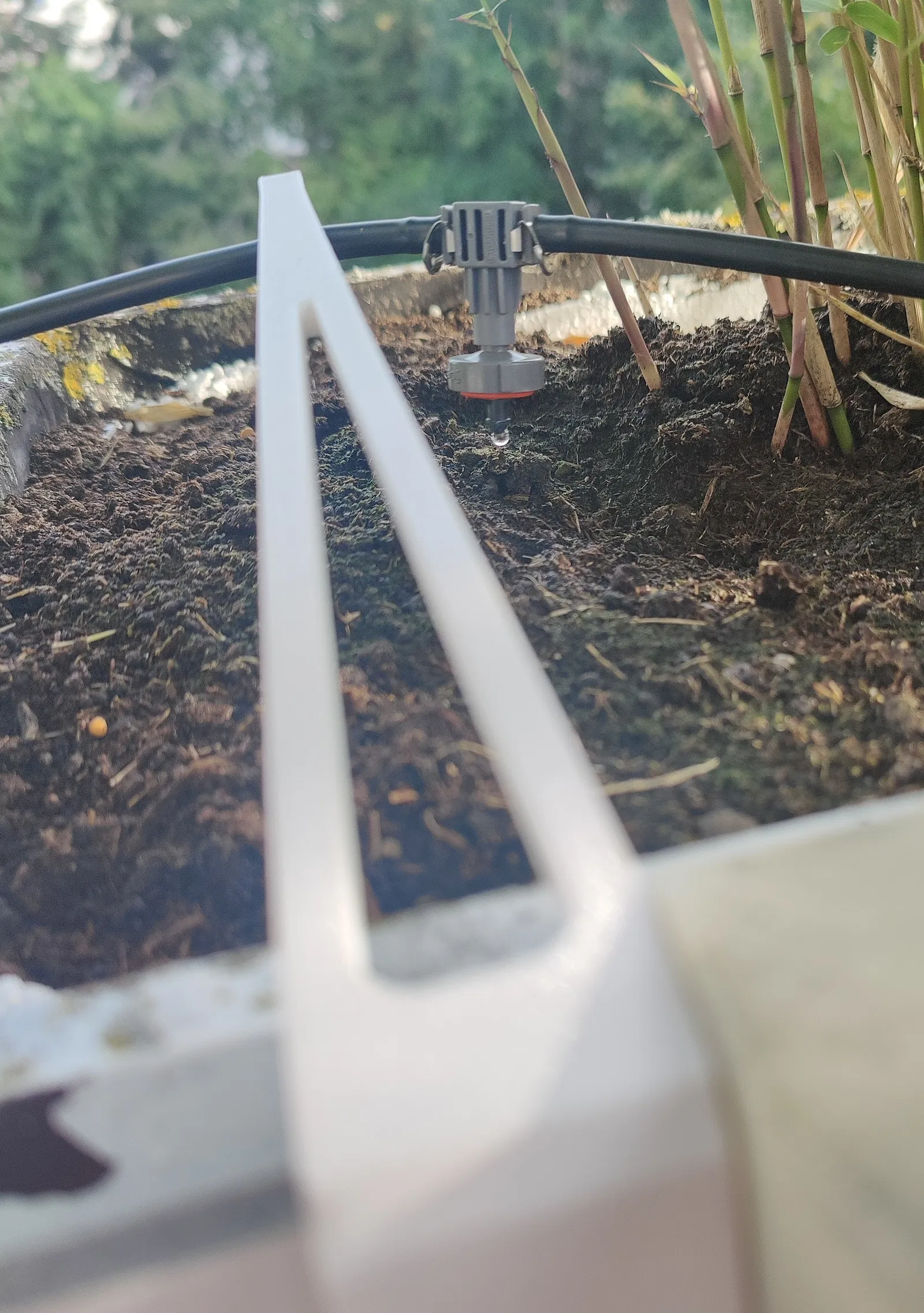 Mấy cái hộp ban công nhà tui có gắn mấy tấm chống thời tiết dày 6mm. Mấy cái đế giữ Gardena micro drip này nó vừa khít vô mấy tấm đó luôn, cuối chỗ đó mình kẹp ống nước lại được. Nhờ vậy mấy cái đầu tưới nó nhỏ nước thẳng đứng xuống.