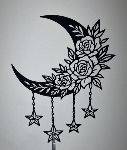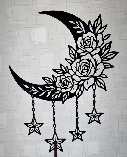 Sự kết hợp tinh tế giữa trăng và hoa – một tác phẩm nghệ thuật treo tường 2D thanh lịch với hình trăng lưỡi liềm được tô điểm bởi hoa lá nở rộ và những vì sao lơ lửng. Rất lý tưởng để in 3D hoặc cắt laser, nó mang lại cảm giác ấm cúng, lãng mạn cho bất kỳ không gian nào.