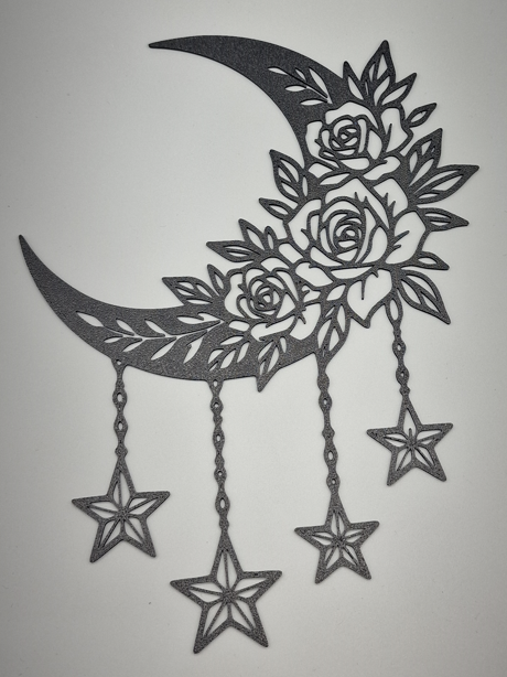 Sự kết hợp tinh tế giữa trăng và hoa – một tác phẩm nghệ thuật treo tường 2D thanh lịch với hình trăng lưỡi liềm được tô điểm bởi hoa lá nở rộ và những vì sao lơ lửng. Rất lý tưởng để in 3D hoặc cắt laser, nó mang lại cảm giác ấm cúng, lãng mạn cho bất kỳ không gian nào 😊