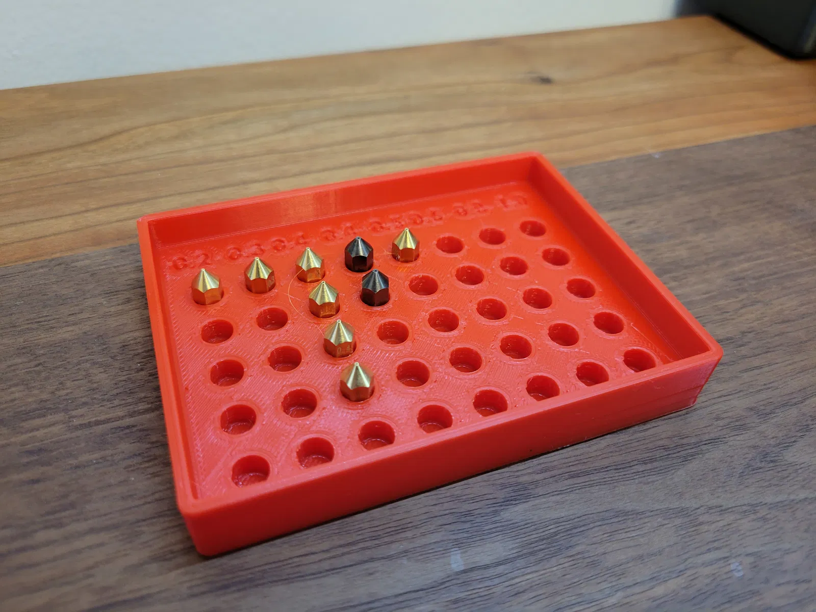 Giá đỡ đầu phun cho đầu phun mk8 5mm. Có nhãn cho nhiều kích cỡ đầu phun khác nhau, bao gồm 0.2, 0.3, 0.4 (2 cái), 0.5, 0.6, 0.8, 1.0. Được in bằng PLA với độền 25%.