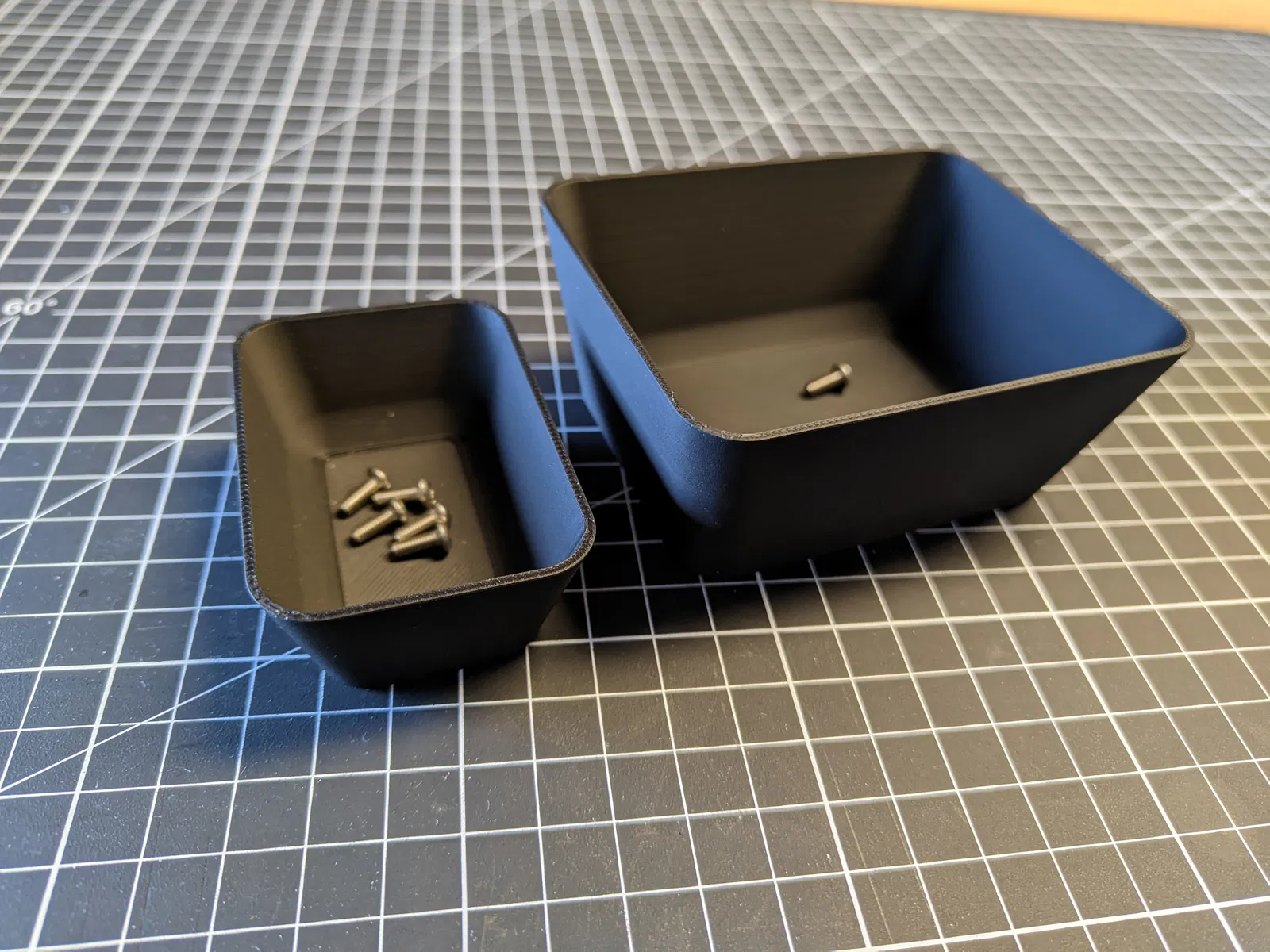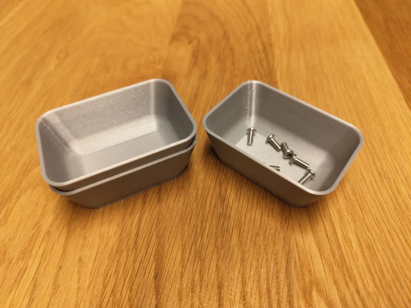 Hộp đựng đồ có thể xếp chồng, có hai kích cỡ khác nhau, lý tưởng để chứa các bộ phận nhỏ như ốc vít. Container có bo góc bên trong để dễ dàng lấy đồ ra. Kích cỡ chi tiết có trong phần tải xuống.