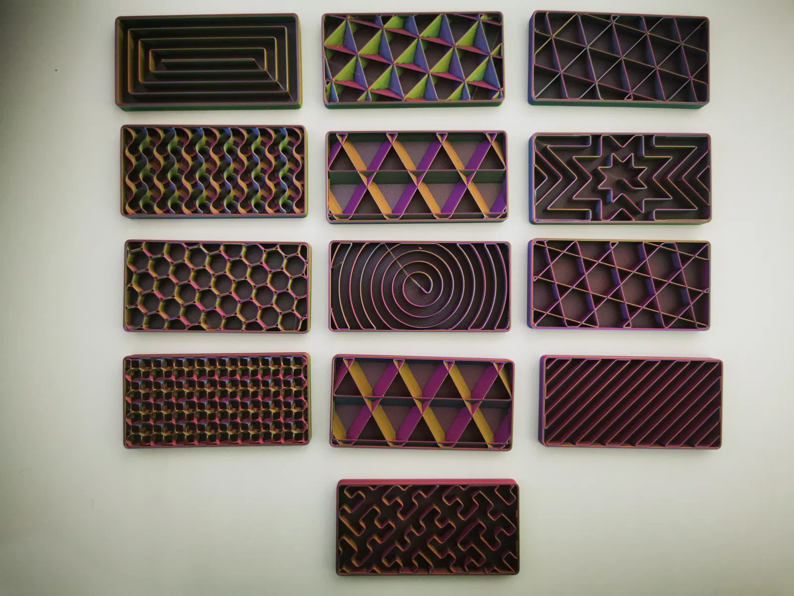 Mẫu thử độ dày lưới in đơn giản - chỉ cần đặt số lớp vỏ trên (top shell layers) thành 0 và thay đổi kiểu lưới in (infill pattern).