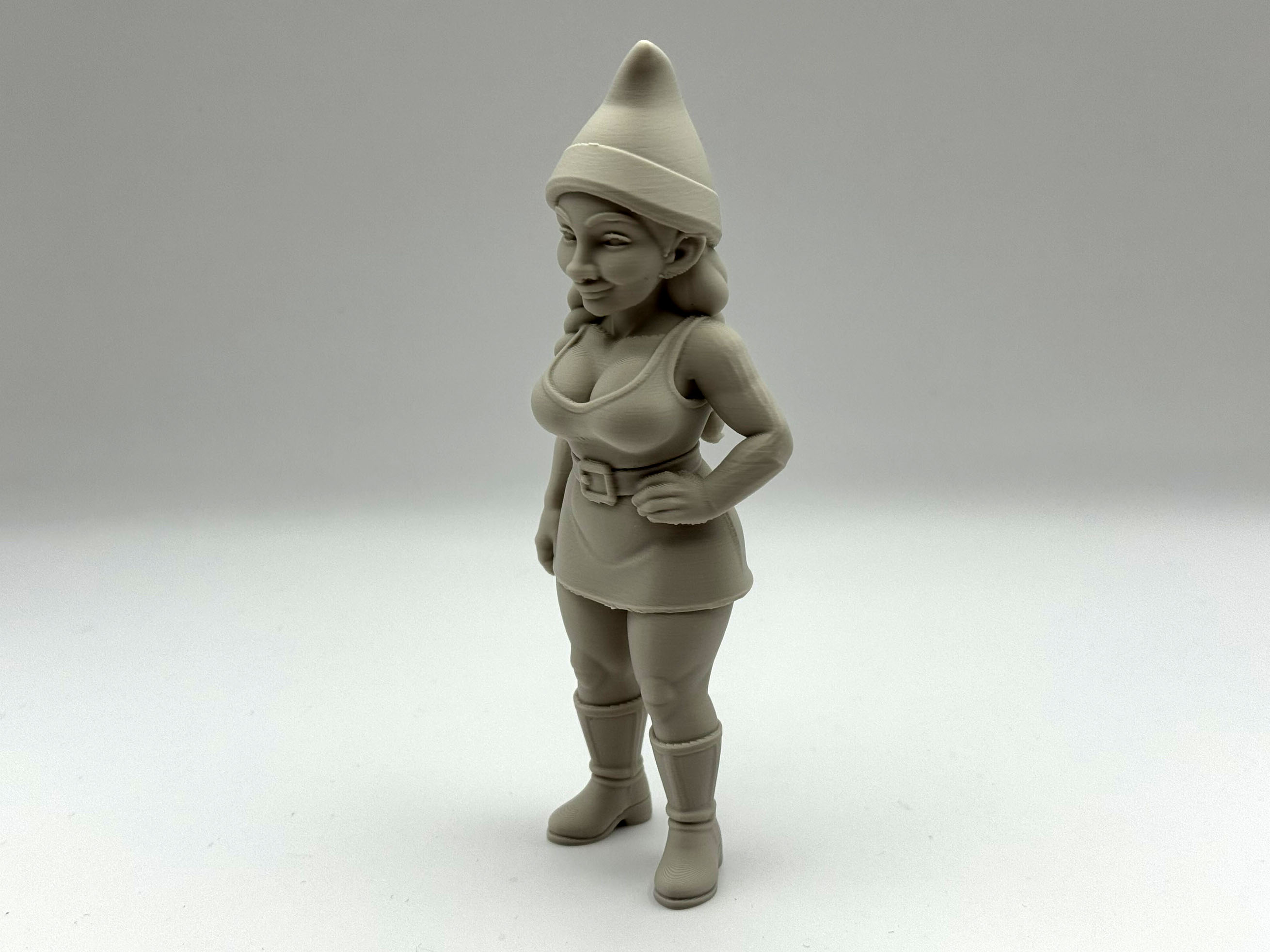 Thêm chút duyên dáng và tinh nghịch cho khu vườn hay kệ sách của bạn với bức tượng nữ thần lùn xinh đẹp này! Đứng đầy tự tin với một tay chống hông và nụ cười tinh nghịch, cô ấy mang đến cá tính, phong cách và một chút táo bạo cho truyền thống thần lùn cổ điển.