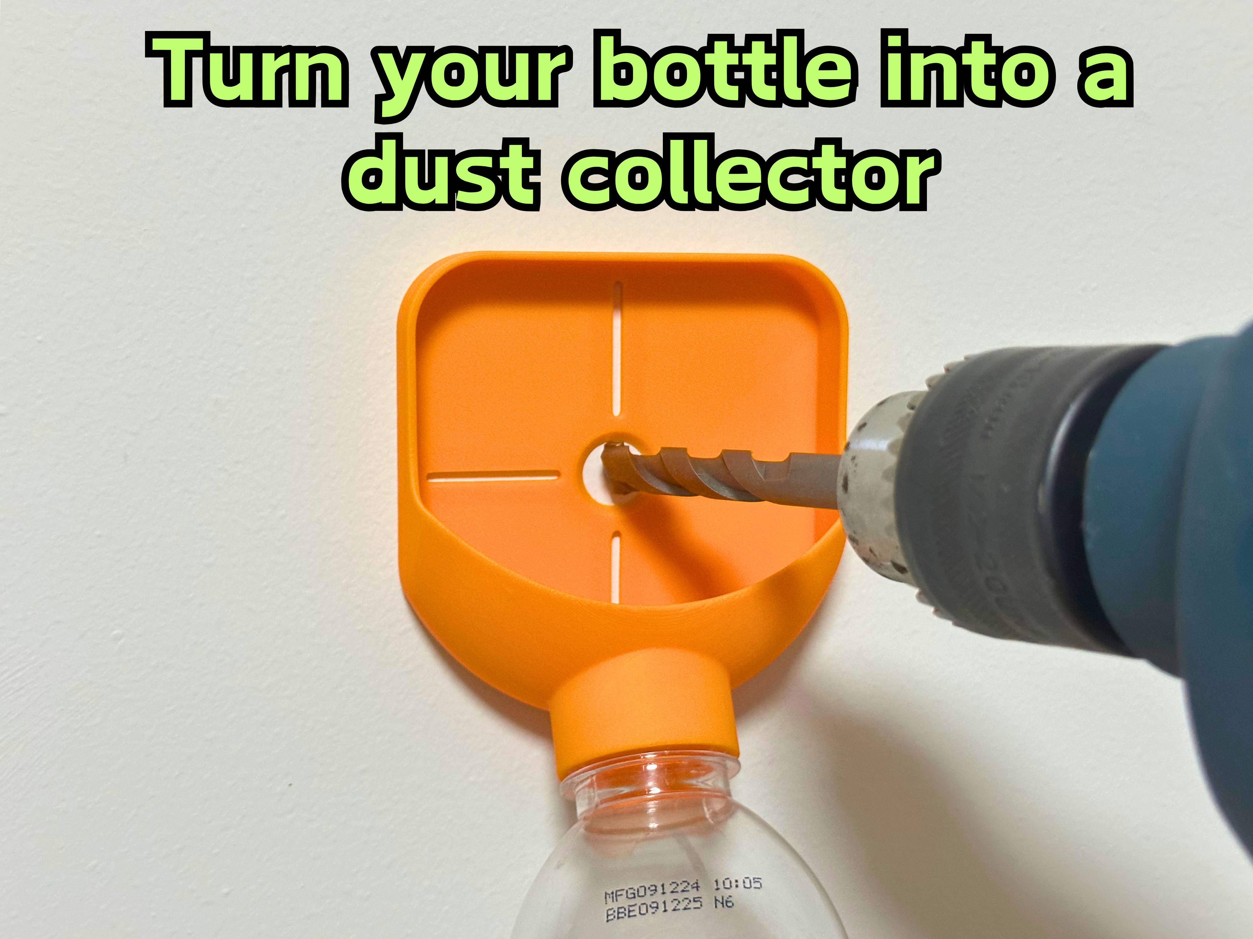 Máy hút bụi cho máy khoan kèm hỗ trợ chai, tấm chắn bụi, adapter và nắp đậy để sử dụng linh hoạt. Tương thích với chai nước khoáng 27-28mm, Coca-Cola, Sprite. Tích hợp adapter và có thêm tệp in chai dự phòng. Phiên bản nâng cao với tấm chắn bụi tăng hiệu quả.