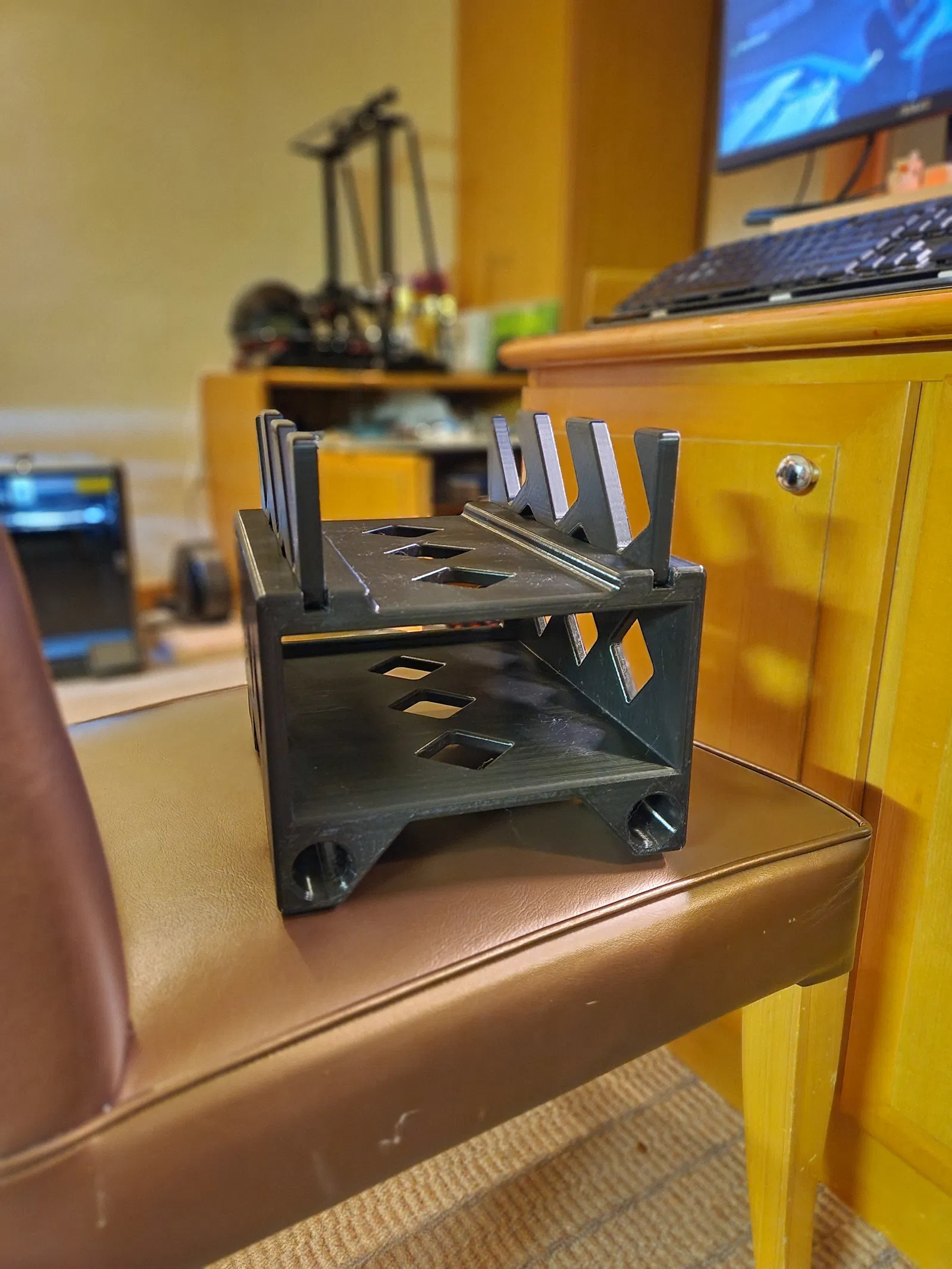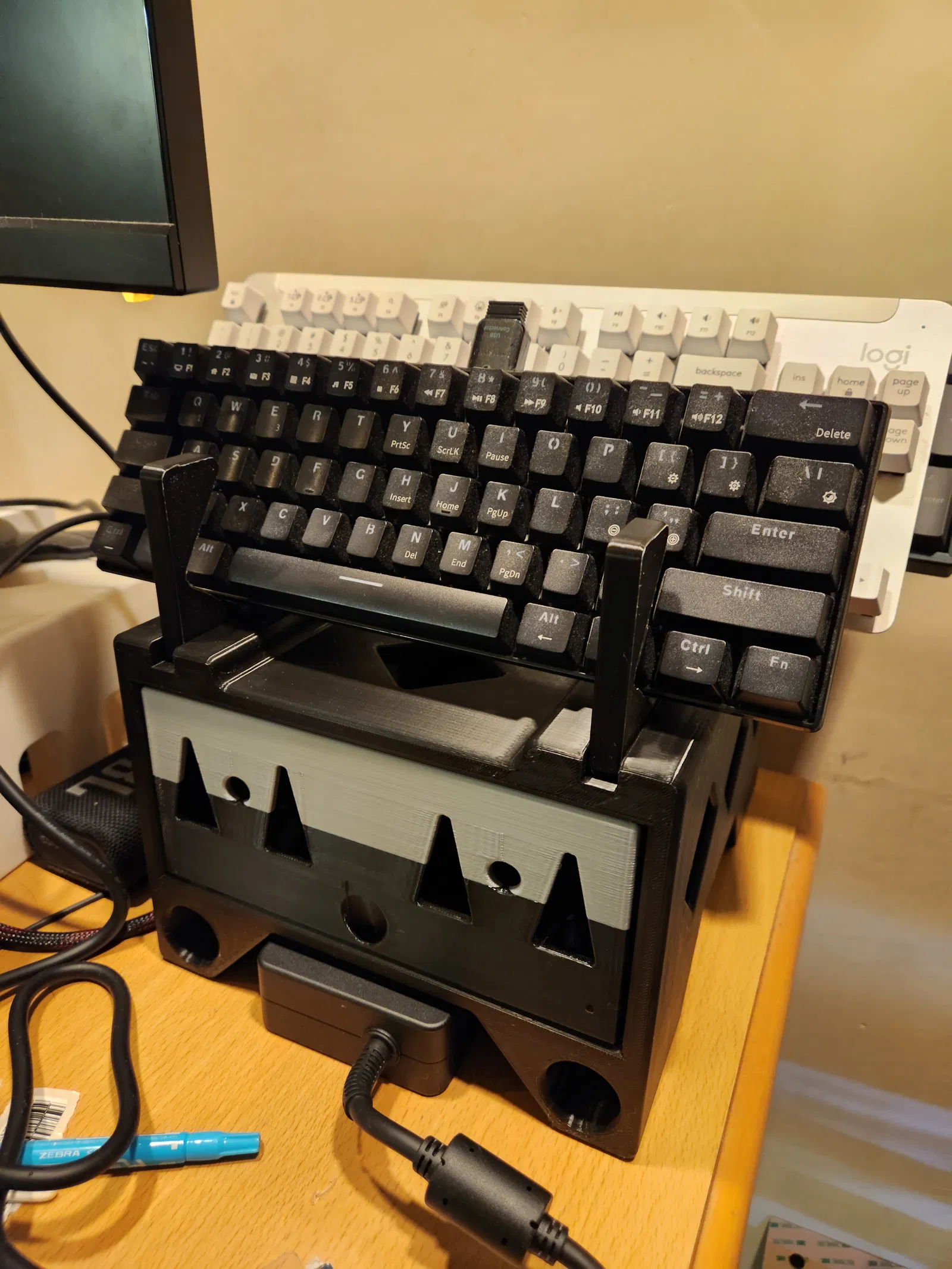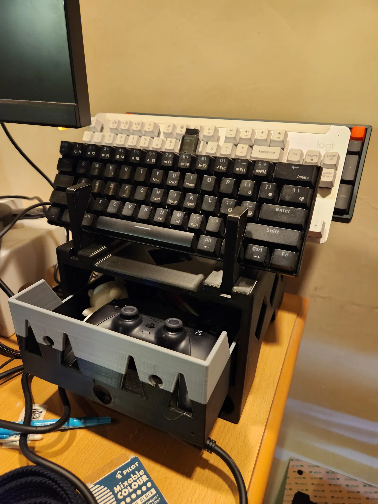 Trưng bày 3 bàn phím cùng lúc mà phía dưới còn có chỗ để đồ nữa. File thiết kế f3d có sẵn, khỏi cần keo dán, sạc laptop để vừa luôn.