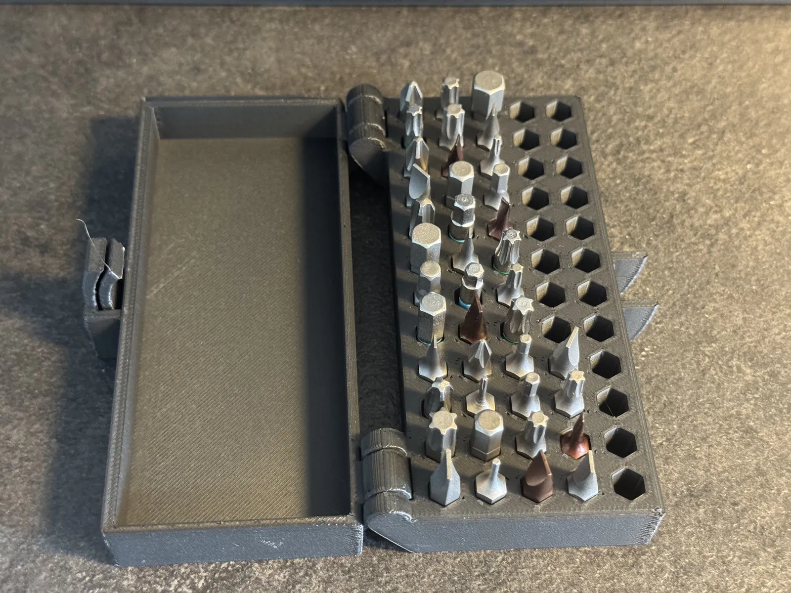 Tui ngán ngẩm mấy mũi khoan với đầu vít cứ lăn lóc tứ tung, nên tui tự thiết kế cái hộp đựng đơn giản này. Hộp đựng được 60 cái theo layout 12x5 nha, giúp chúng gọn gàng, an toàn và lấy ra xài cũng dễ nữa.