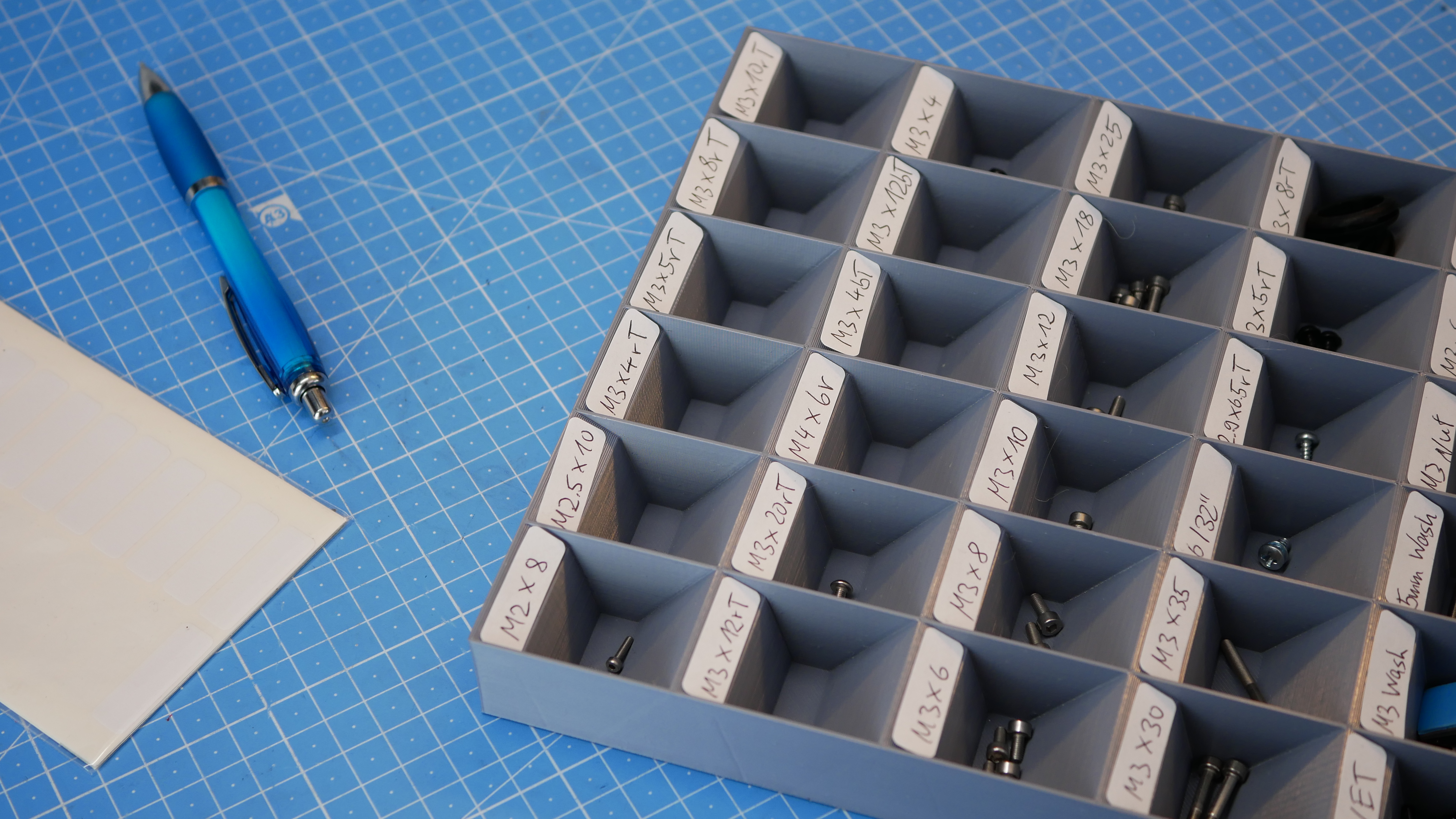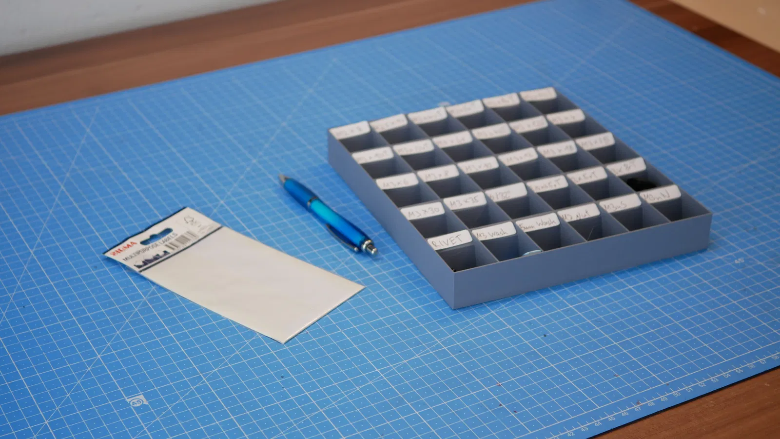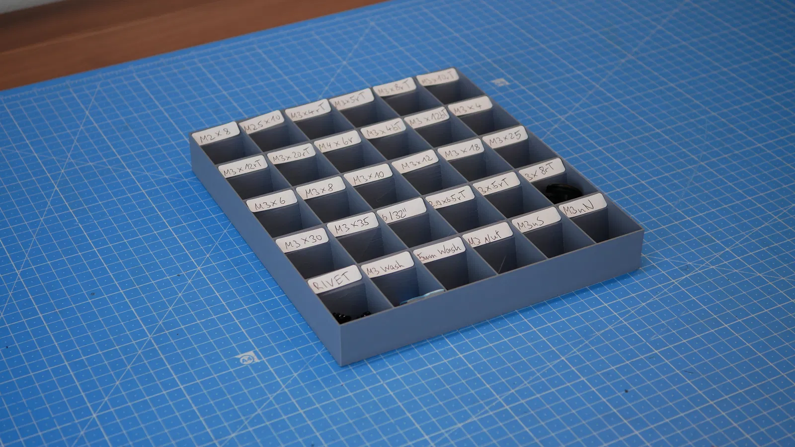 Bộ sắp xếp 30 ngăn tiện dụng cho ốc vít, đai ốc, bu lông, v.v. Tối ưu cho Prusa MK4, CORE One. Thiết kế nghiêng giúp dễ nhìn và lấy linh kiện. In ấn nhanh chóng, không cần support. Phù hợp cho việc lắp ráp hiệu quả.