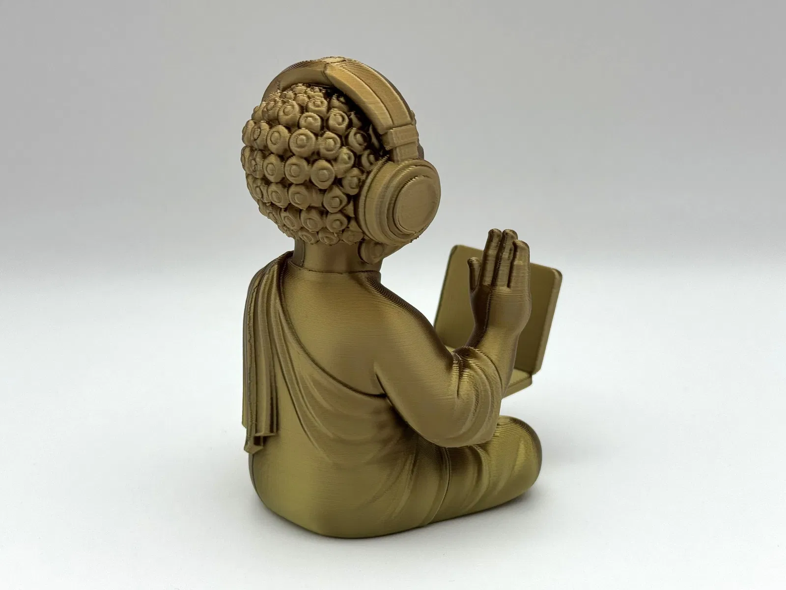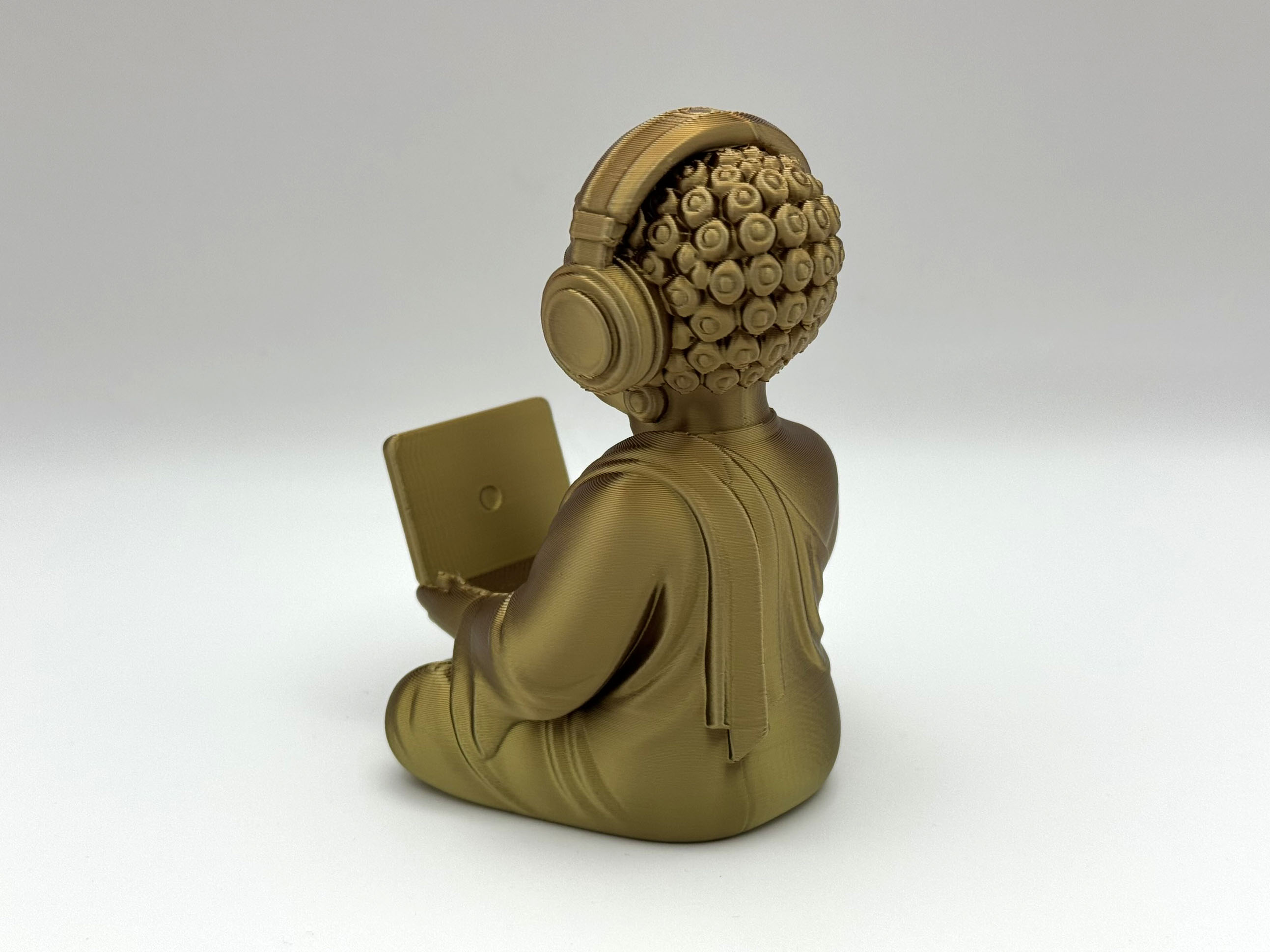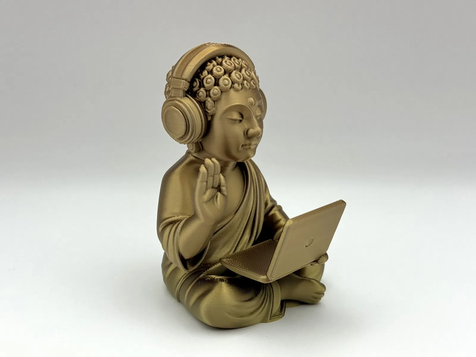 Tượng Phật Techno kết hợp giữa thiền định và công nghệ, với tai nghe và laptop. Là vật trang trí độc đáo cho bàn làm việc, mang lại cảm giác bình yên và giác ngộ trong thời đại số. Cần dùng supports khi in.
