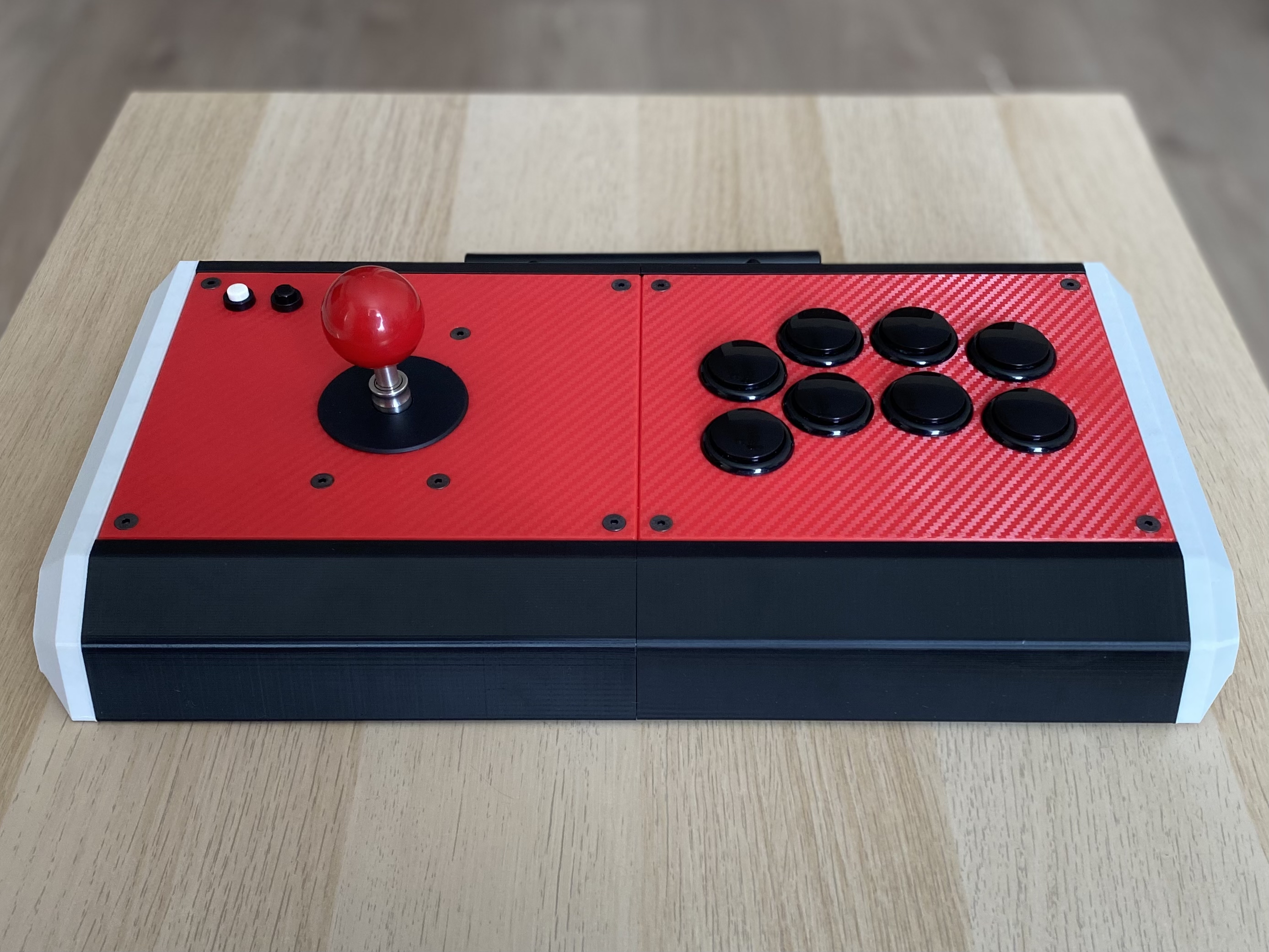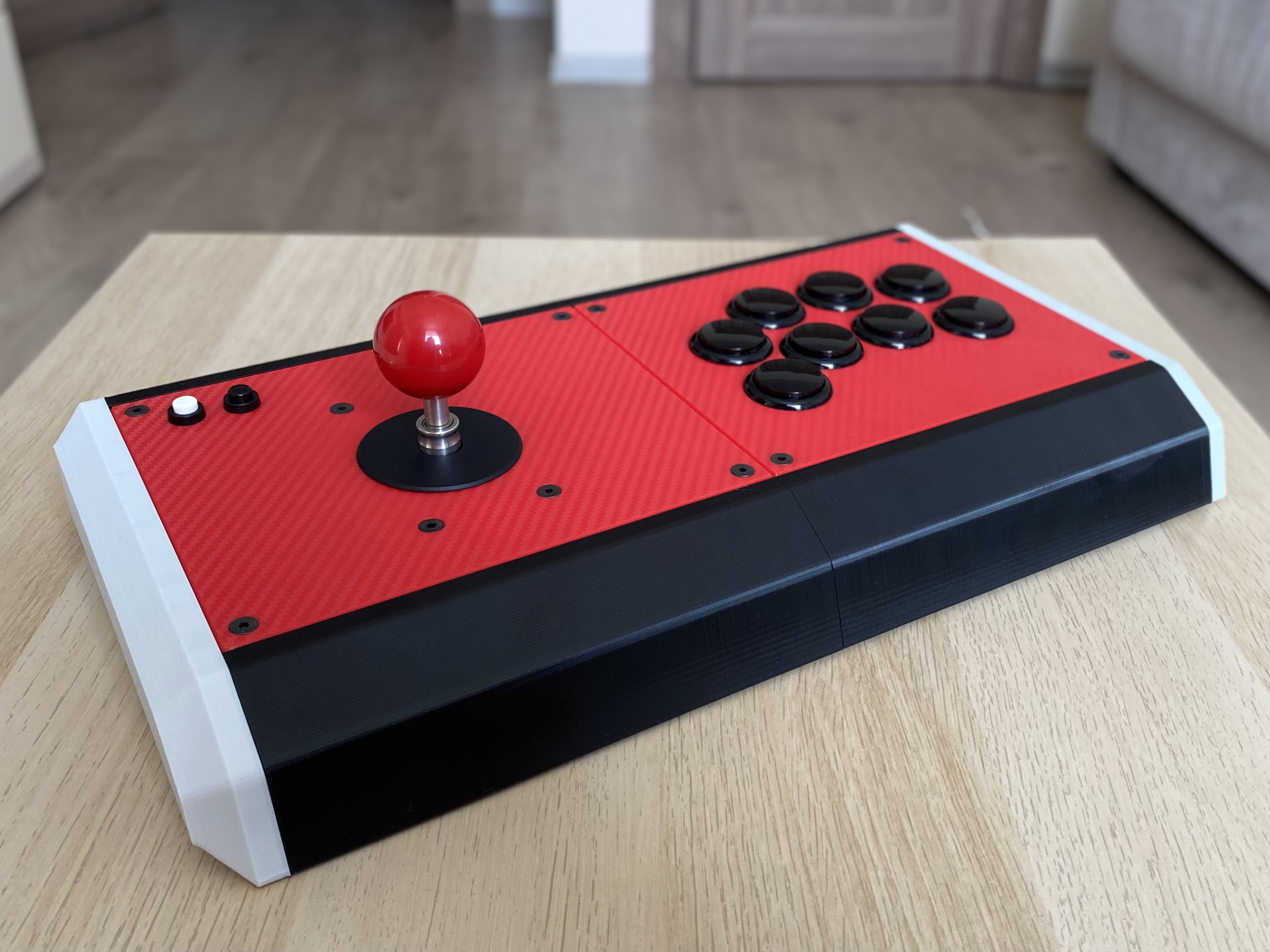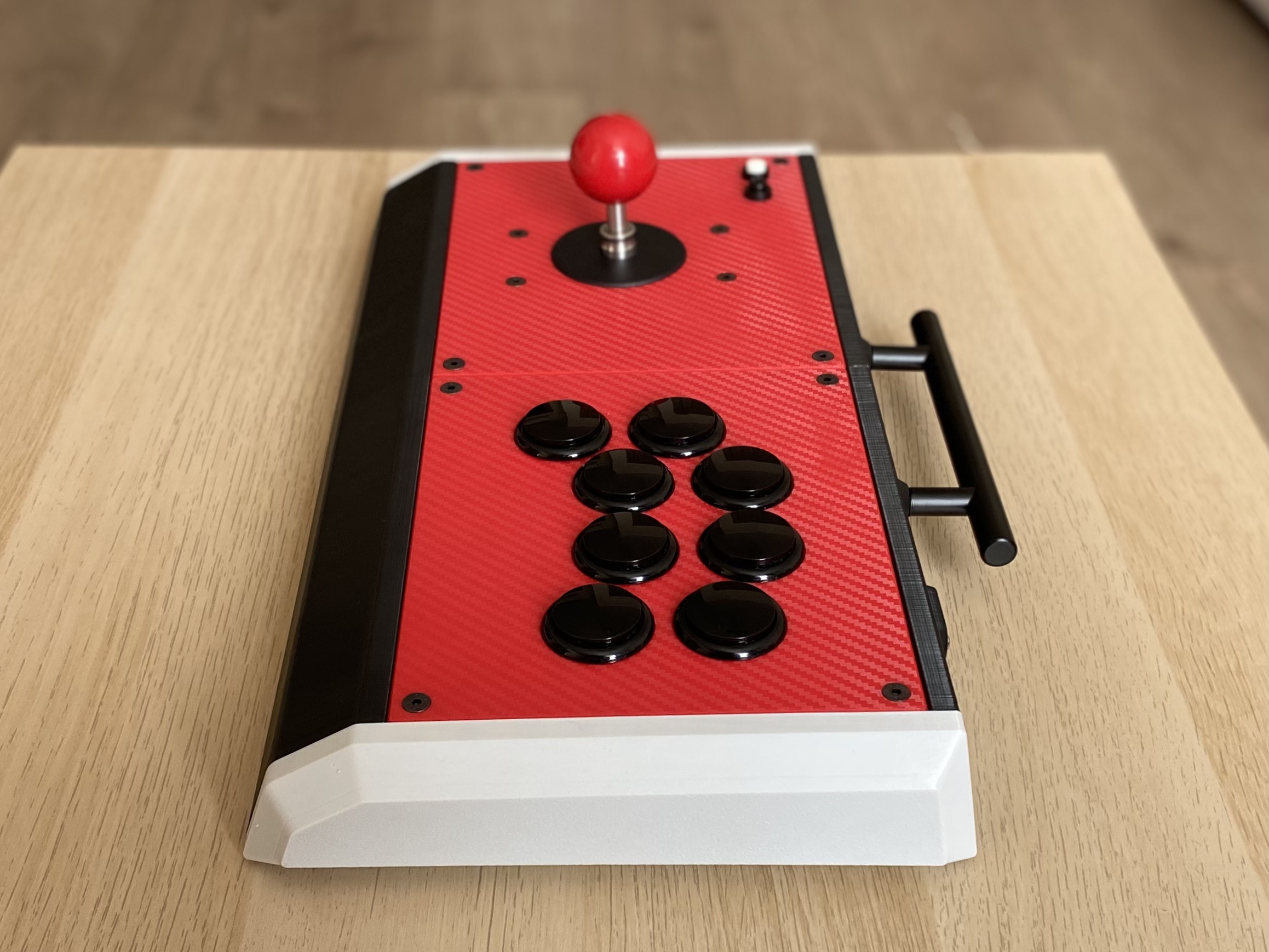 Mô hình tay cầm Arcade aBox 1.0.0 với kích thước 400x210mm, bảng điều khiển nghiêng 1°44', bố cục nút Sega 2P, cáp USB-C rời và tay cầm chắc chắn. Vật liệu cần thiết bao gồm các loại ốc M4, M6, cổng USB-C, nút bấm và tay nắm.