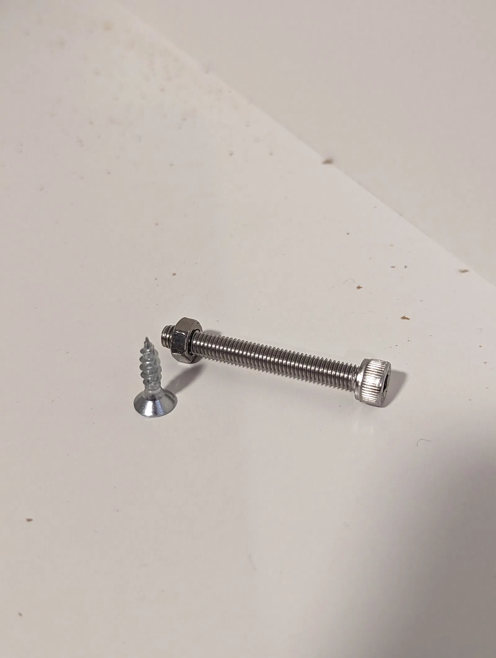 Tôi đã dùng 2 con vít nhỏ từ một gói vít IKEA và vài con vít lục giác M5 40mm cùng với đai ốc tương ứng. Chắc chỉ cần loại 35mm hoặc nhỏ hơn là được rồi.
