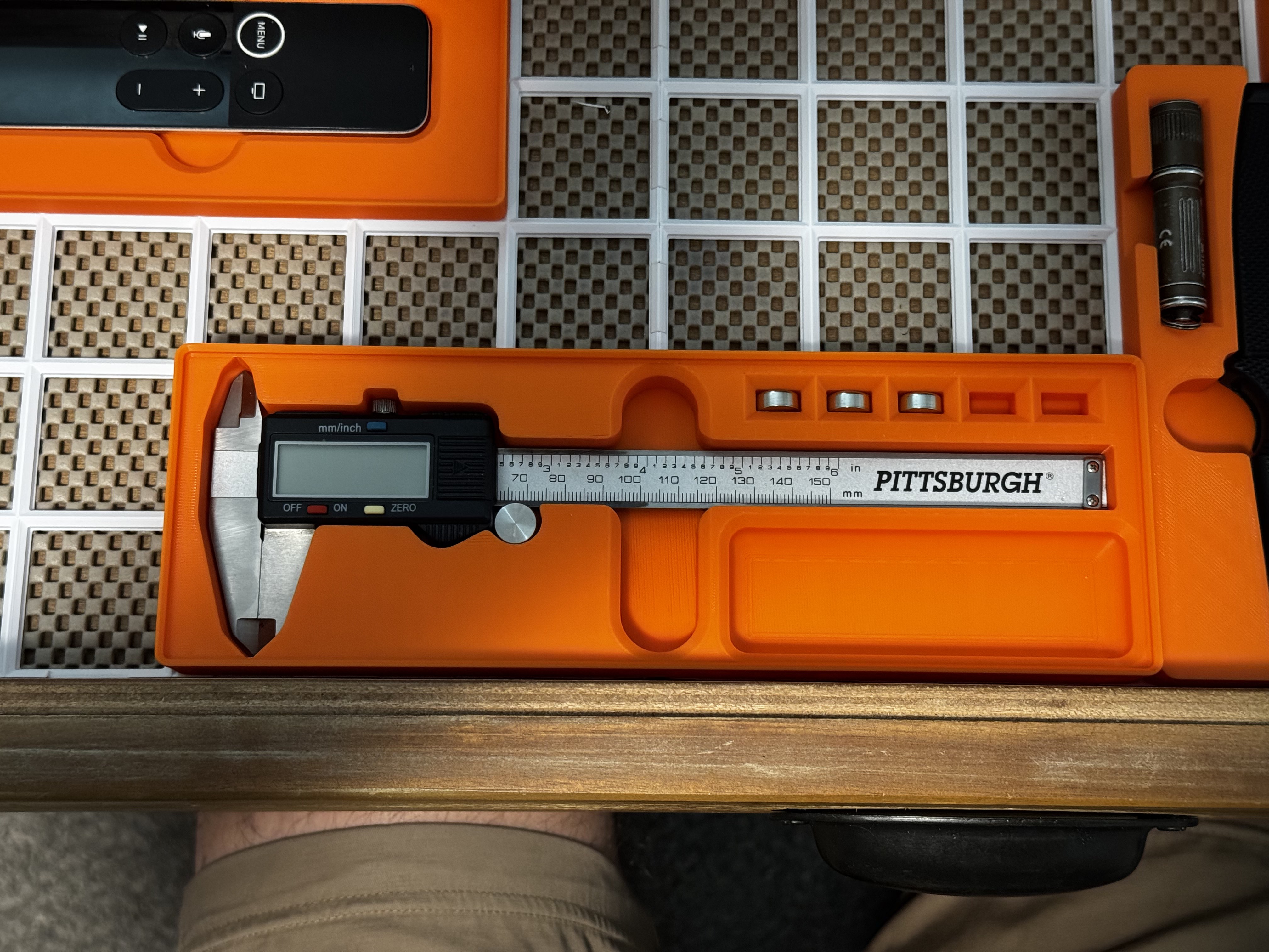 Vừa với mấy cái kềm của tui bên Harbor Freight và chắc là cũng nhiều loại khác nữa. Tui cũng thêm chỗ để pin với một khoảng trống nữa cho đỡ tốn dây in.