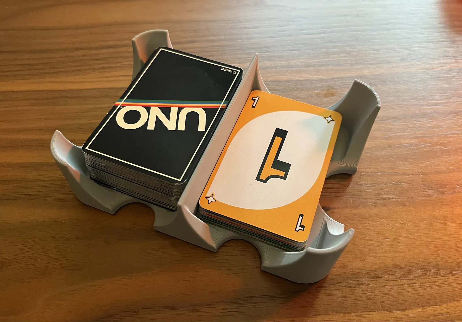 Khay đựng bài Uno được chỉnh sửa lại để phù hợp với kích thước bài Uno nhỏ hơn. Phiên bản này có chỗ lõm cho chân đế, bạn có thể tùy chỉnh độ sâu để chân đế bám chắc hơn. Dùng chân đế McMaster [8771K82](https://www.mcmaster.com/8771K82/) để hạn chế trượt.