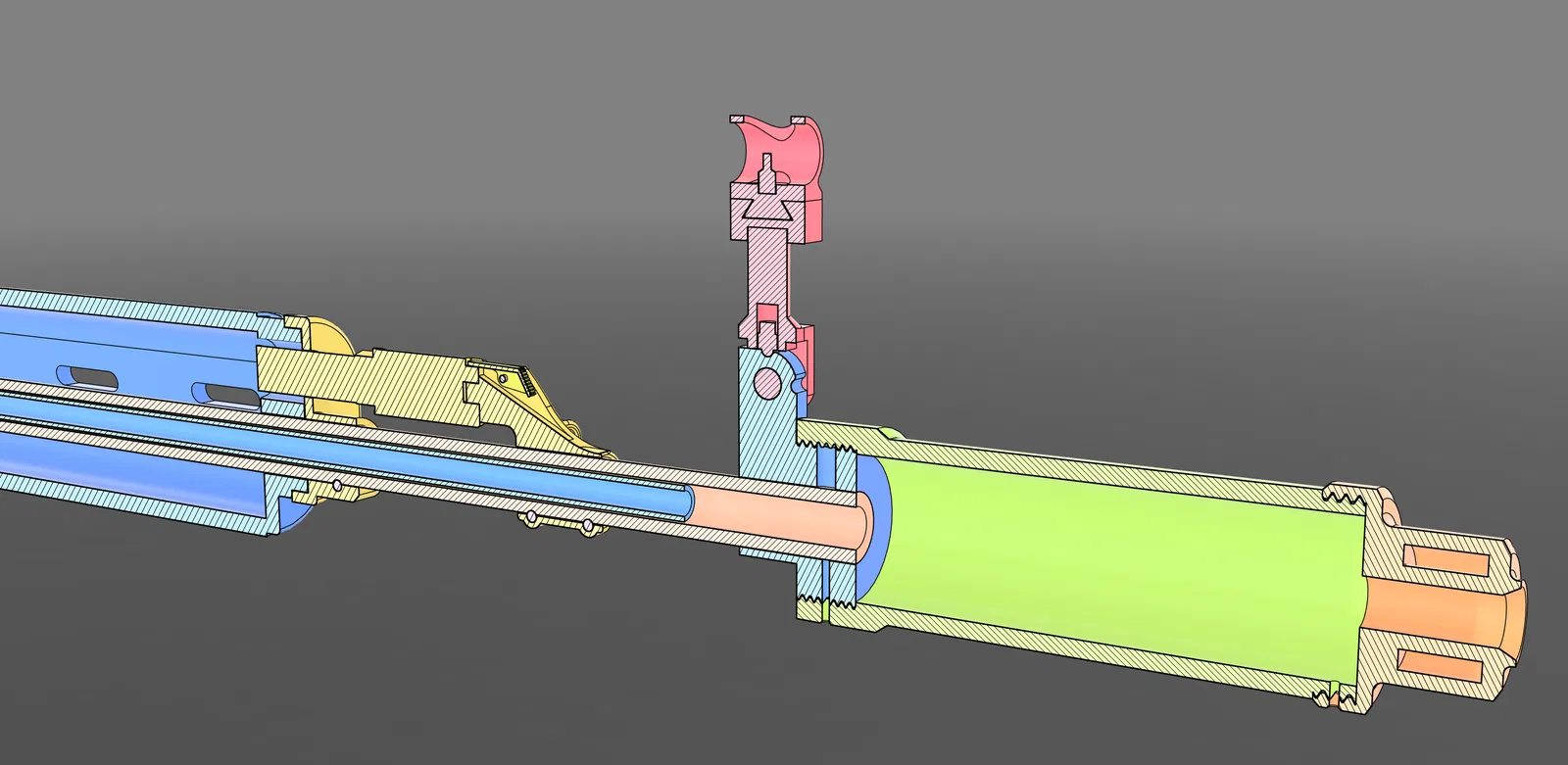 Bạn sẽ cần cắt một vài rãnh trên ống bạn chọn cho nòng ngoài. Rãnh đầu tiên là nơi nòng gắn vào thân súng, nó có lẽ là thừa và bạn có thể bỏ qua nó bằng cách loại bỏ phần nhựa nằm trong rãnh (bộ phận đó là "Giá đỡ Đầu Nòng"). Rãnh tiếp theo là dành cho ốc vít đi qua kẹp giữ ốp tay phía trước. Tôi khuyên bạn nên lắp ốp tay trước với cả hai kẹp giữ, sau đó đánh dấu lỗ trên nòng trước khi cắt rãnh. Đảm bảo ốp tay không bị xoắn hay gì cả. Tham khảo bản vẽ CAD để biết độ sâu cần cắt. Các rãnh cuối cùng là dành cho khối gas, nơi hai ốc vít hoạt động tương tự như trên bộ giữ ốp tay. Về cơ bản, chỉ cần làm tương tự ở đây.