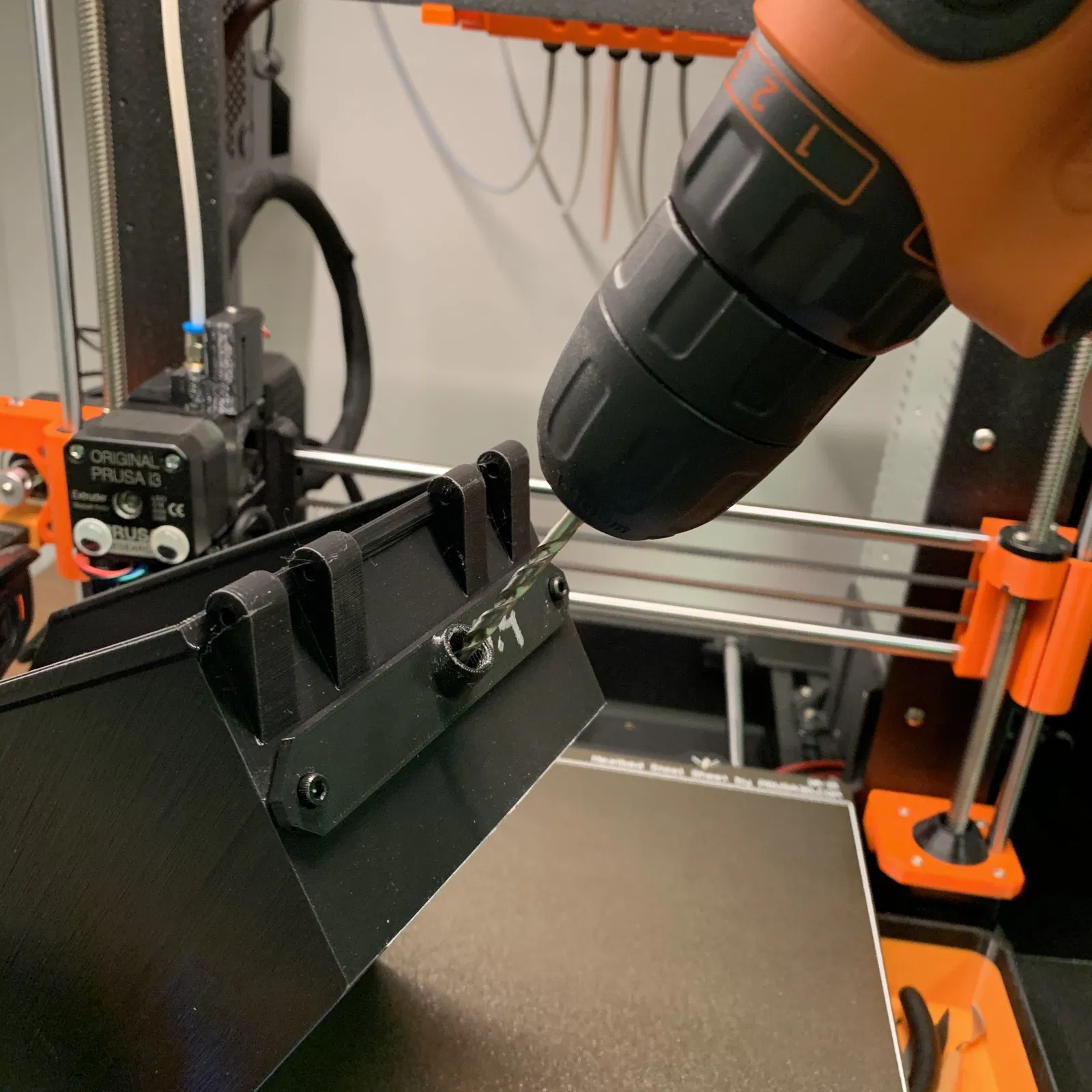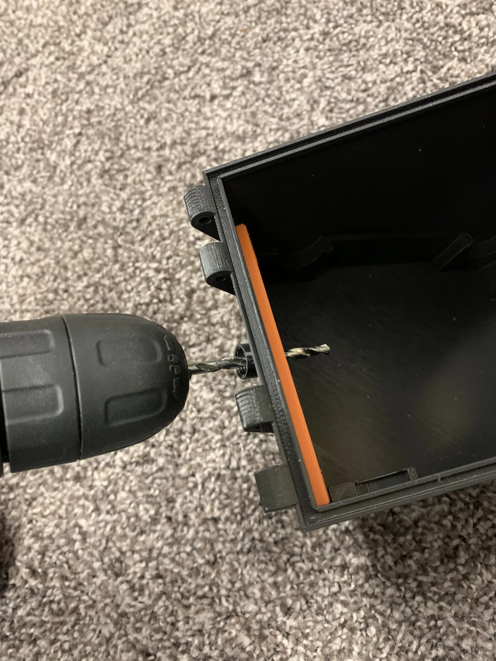 Cái khe mà sợi filament chui qua trong hộp nó hơi hẹp để nhét ống PTFE vô, nên bạn sẽ cần dùng khoan để làm rộng nó ra một chút. Cách làm: Gắn cái món in này vô mặt trước của hộp, rồi dùng cái lỗ đó để làm dấu chỗ bạn cần khoan vô hộp.