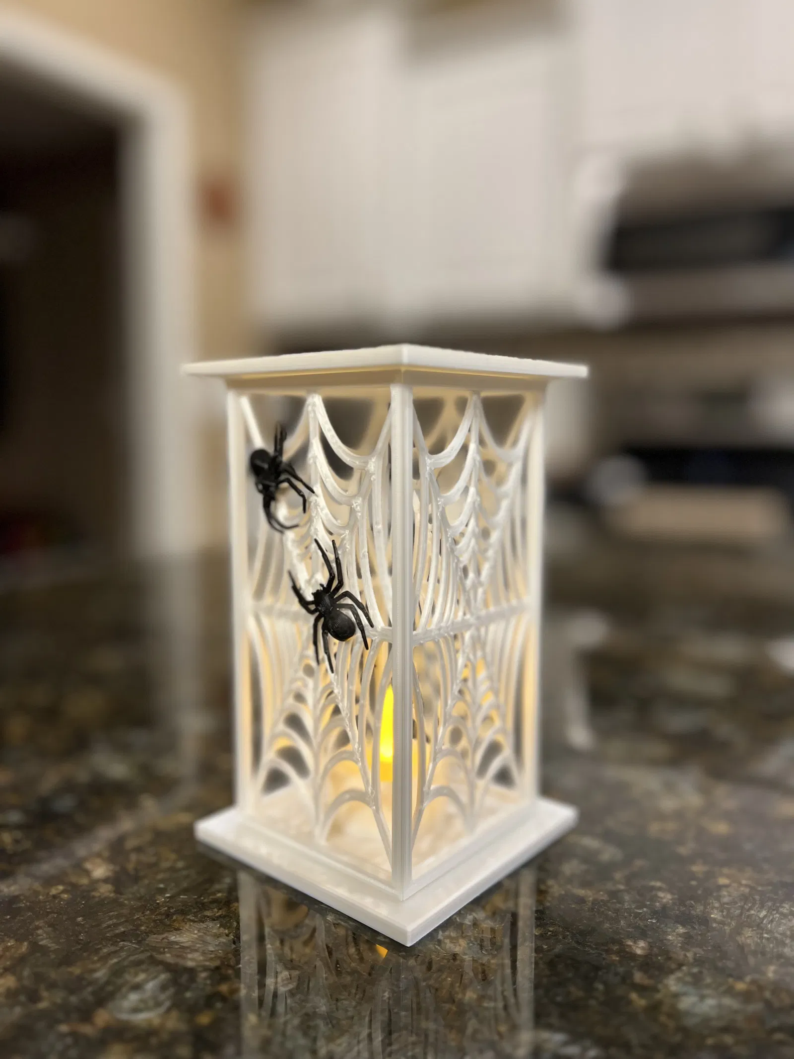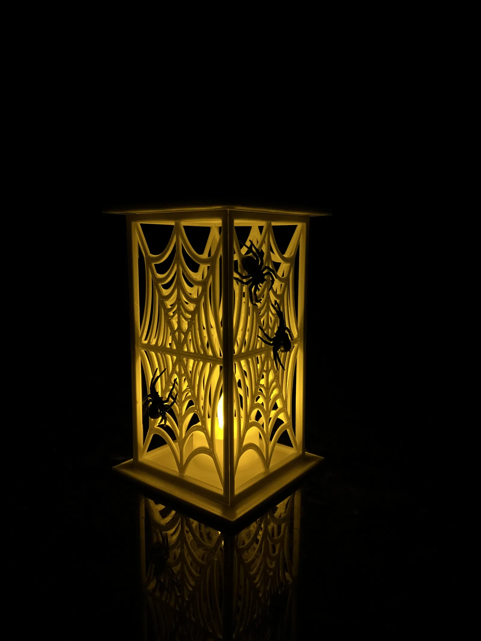 Tôi đã lấy thiết kế Đèn lồng tuyệt vời do Laptop-Guy tạo ra và thực hiện một vài sửa đổi cho các đèn lồng trong tương lai. Vấn đề lớn nhất của tôi với bản gốc là do cách lắp ráp, một mặt sẽ dày hơn mặt kia, vì vậy tôi đã thêm một góc 45 độ vào các tấm ghép để chúng khớp với nhau tốt hơn và có vẻ ngoài đồng đều. Khi làm điều này, tôi cũng phải điều chỉnh đế để phù hợp với kích thước mới. Tôi thấy rằng việc in 4 tấm ghép giống hệt nhau rồi in nhện riêng lẻ và dán chúng vào sau khi in sẽ tốt hơn. Tôi đã sử dụng nhện được thiết kế bởi Drawn_To_Spec của Black House Spider. Nếu bạn muốn có phần trên, hãy in đế hai lần, hoặc không sử dụng phần trên, tùy bạn. Để ghép các tấm lại với nhau, tôi khuyên dùng băng dính hai mặt nhưng bạn cũng có thể dùng keo nếu thích. Đối với đèn bên trong, tôi sử dụng đèn votive LED hoặc bạn có thể dùng nến LED nhỏ chạy bằng pin. Tôi đã in mẫu của mình bằng sợi PLA màu trắng lụa, nhưng loại phát quang trong bóng tối cho các tấm ghép cũng sẽ hoạt động rất tốt.