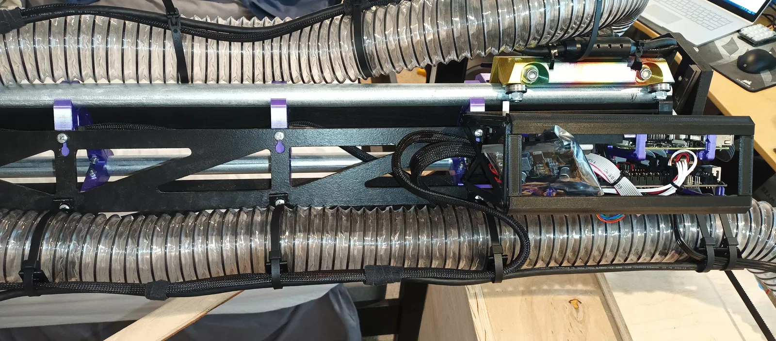 Vấn đề: Có ai khác thấy ống hút chân không 2.5" kèm dây điện của mình bị võng xuống và đập vào dây đai Y, hoặc mắc vào bộ giữ dây đai phía sau bên trái không? Cũng thấy ống hút chân không nâng cả hộp điều khiển lên, không giúp ích gì nếu dây điện bị bó chung trong móc với ống hút chân không.