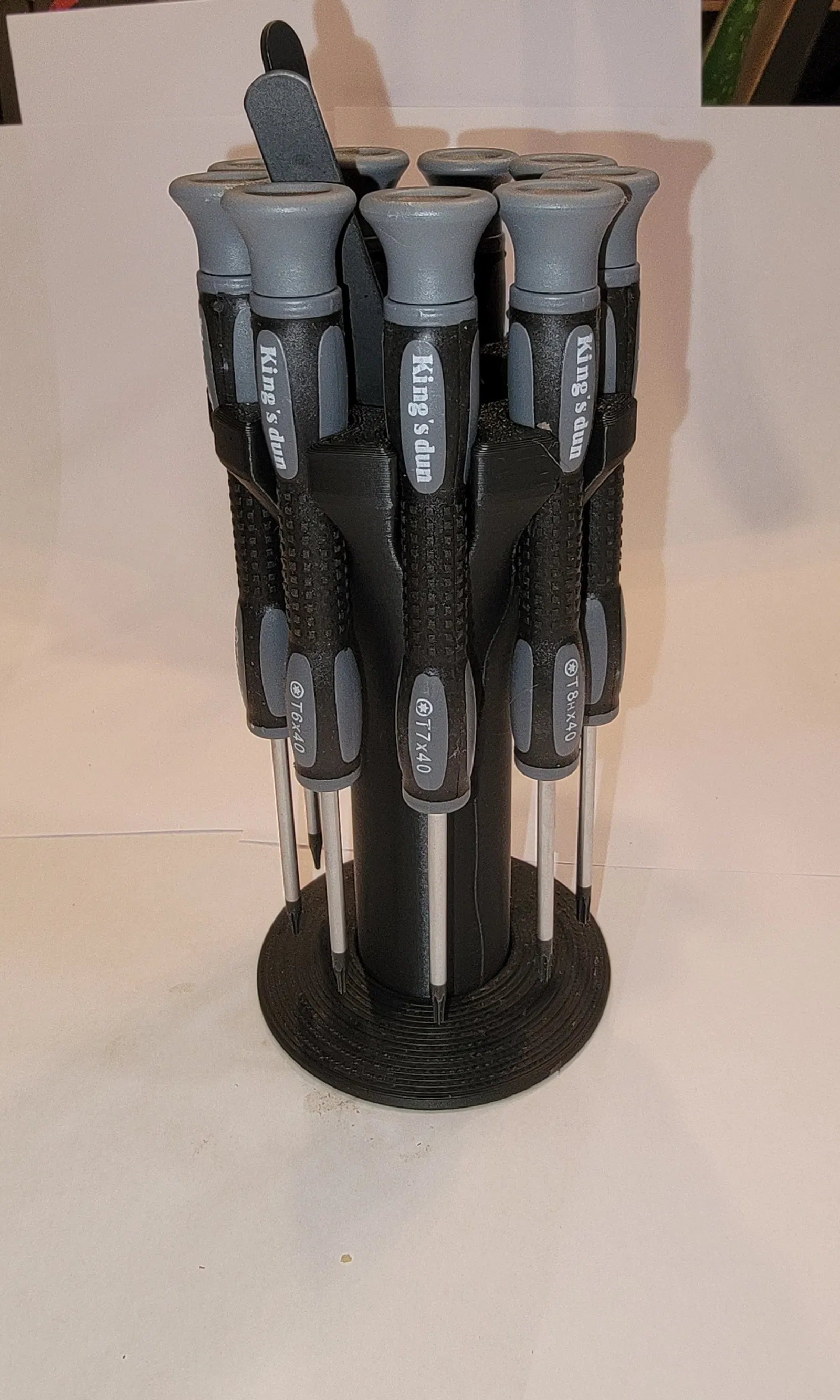 Giá đỡ dụng cụ kiểu Bàn Xoay (Lazy Susan) cho bộ tua vít King'sdun (https://a.co/d/4q5Wsgs). Có thể để chín cây tua vít cùng một lỗ ở giữa để đựng nhíp hoặc các dụng cụ nhỏ khác. Sử dụng vòng bi 625.