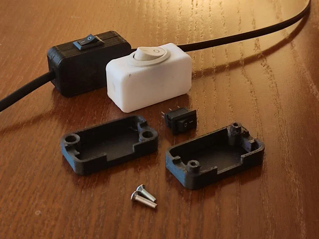 Hộp công tắc nguồn trực tuyến nhỏ gọn, dễ in cho dây điện và cáp USB. Lý tưởng cho đèn bàn, văn phòng, hoặc các dự án Arduino. Sử dụng công tắc bập bê 10x15mm hoặc 21x15mm. Cần 2 vít M3 hoặc keo để lắp ráp. An toàn khi sử dụng.