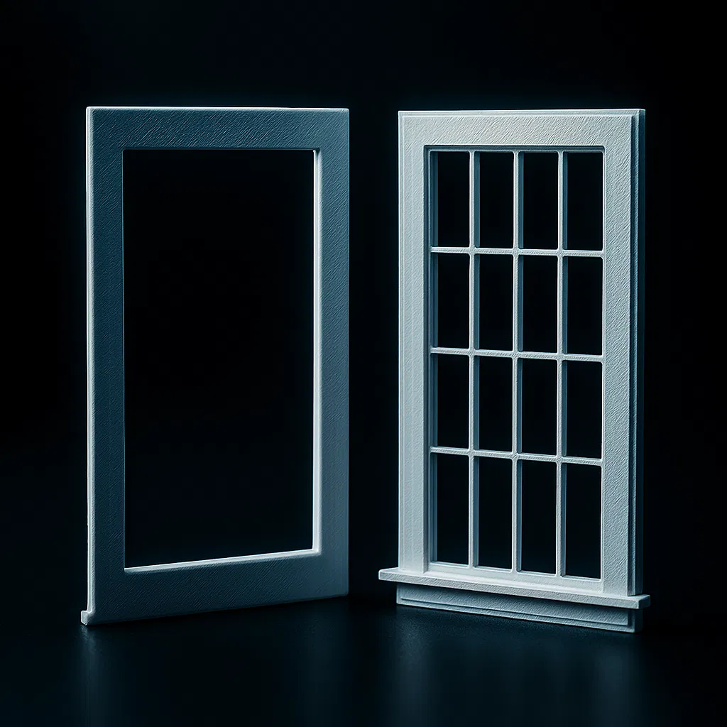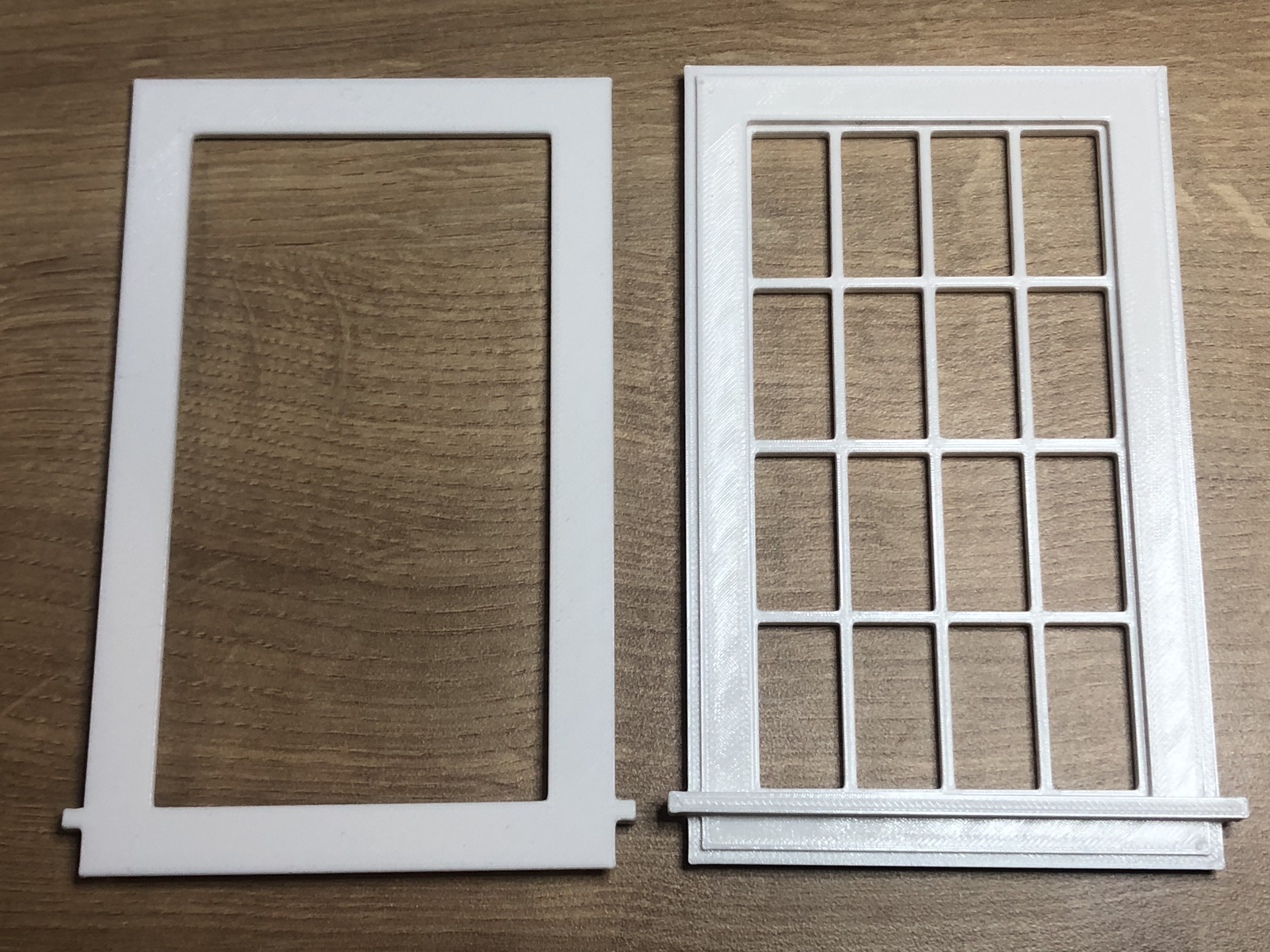 Bộ phận cửa sổ hoàn chỉnh cho nhà búp bê, bao gồm 3 phần chính: 2 khung trong-ngoài và 1 tấm kính cửa sổ. Thiết kế chia nhỏ giúp in ấn dễ dàng hơn mà không cần hỗ trợ. Có thể bỏ qua khung trong nếu không cần thiết.