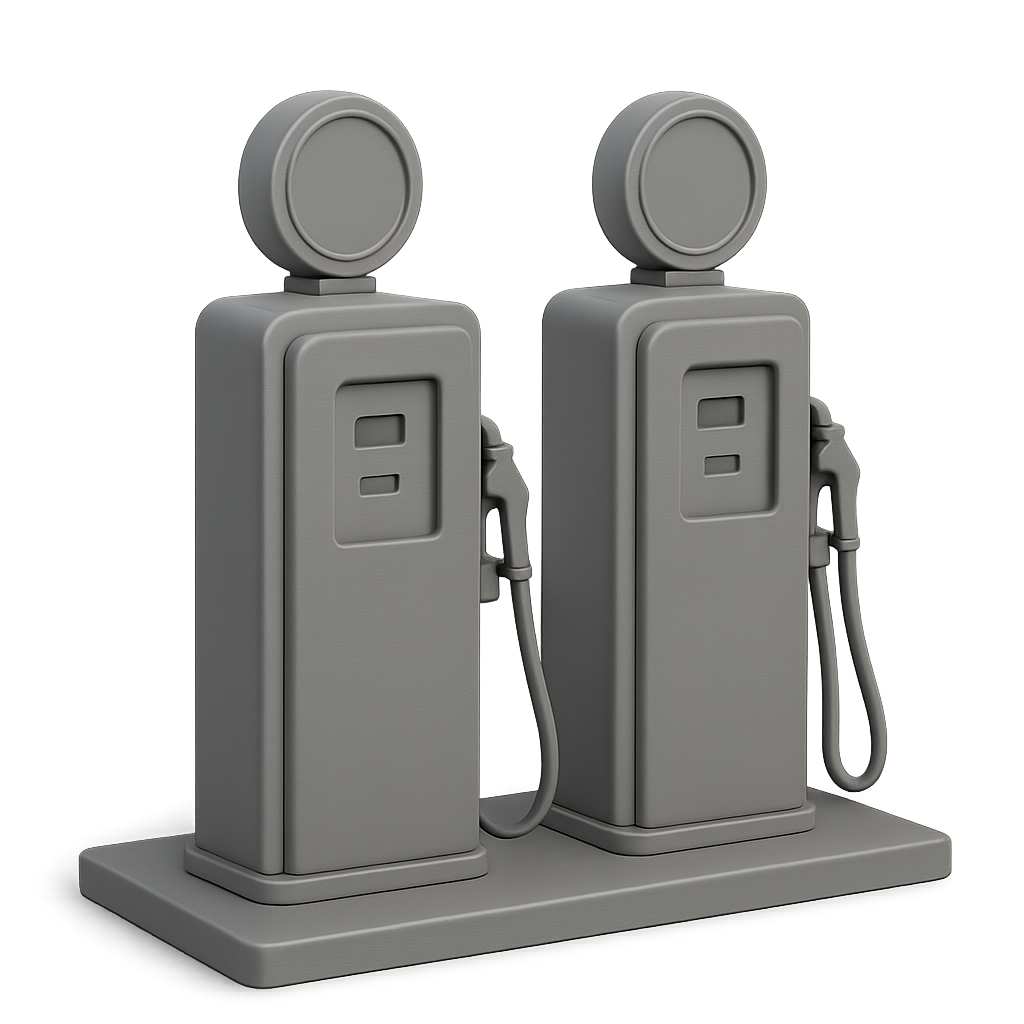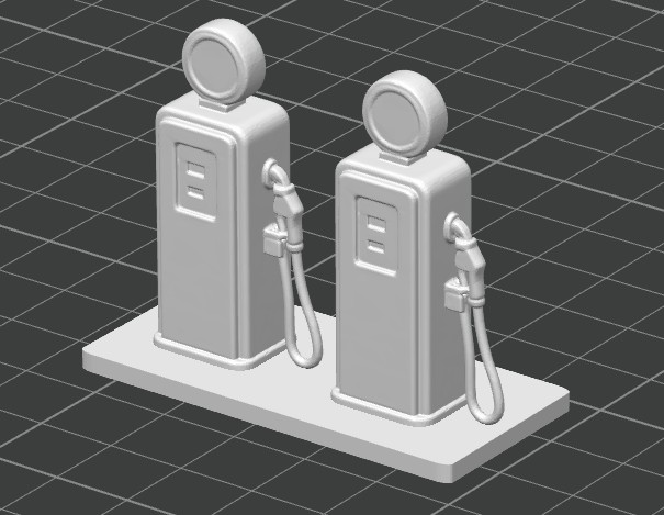 File tải xuống chứa một file STL duy nhất, sẵn sàng để in, mô phỏng hai máy bơm xăng kiểu thập niên 1950.