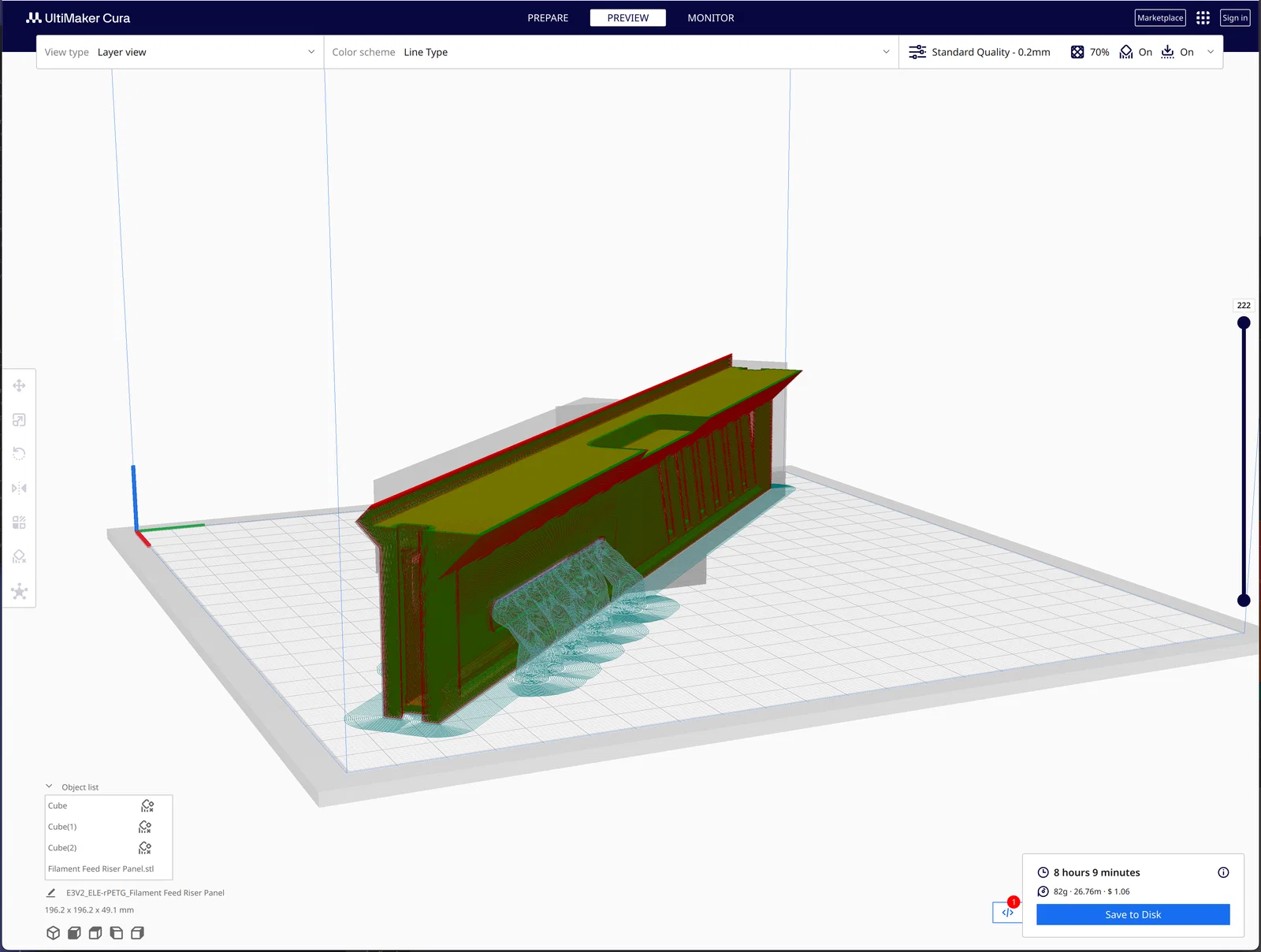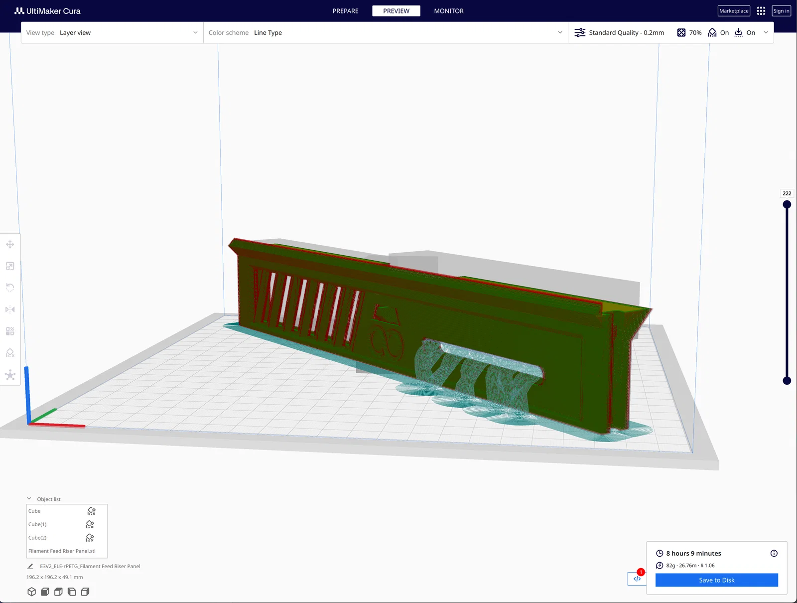 Lớp: 0.3mm - Đây có thể không phải là lựa chọn tốt nhất cho chất lượng, nhưng được chọn để giảm thời gian in khi tôi làm các bộ phận đầu tiên trên Ender 3 V2. Tôi đã hơi lo lắng rằng việc mở lỗ thông hơi và điều khiển có thể khó khăn, nhưng nó đã ổn. Ở lớp 0.3mm, tôi có một khu vực thô ráp ở phần nhô ra phía trước dốc ở trên cùng. Các bộ phận CC cũng sử dụng lớp 0.3 cho vẻ ngoài nhất quán - nhưng trên thực tế, chúng trông đẹp hơn nhiều vì CC hoạt động rất tốt.