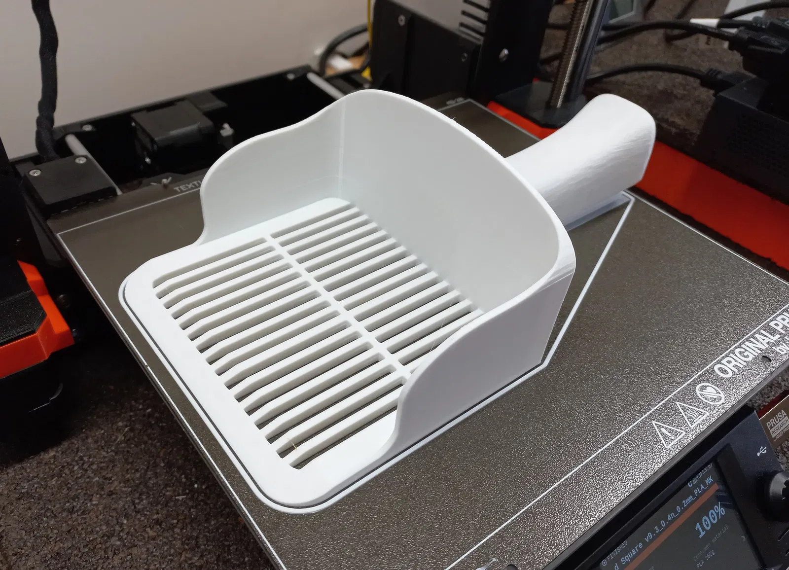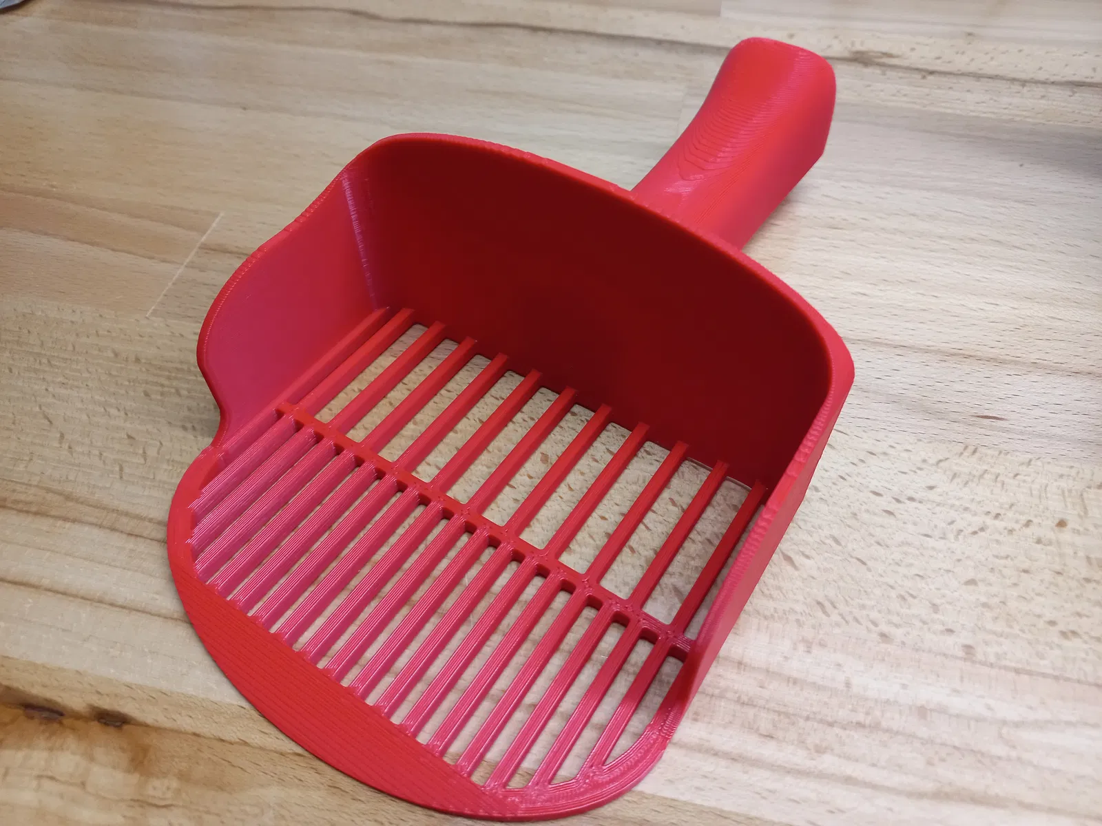 Tui đã thay đổi hộp vệ sinh cho mèo từ hồi làm cái rổ rá vệ sinh đời đầu, nên phiên bản cũ gặp khó khăn khi dọn vào mấy góc hẹp của hộp mới. Giờ có hai phiên bản. Phiên bản cũ với lưỡi tròn, và phiên bản mới với lưỡi vuông hơn và bán kính góc bo tròn nhỏ hơn.