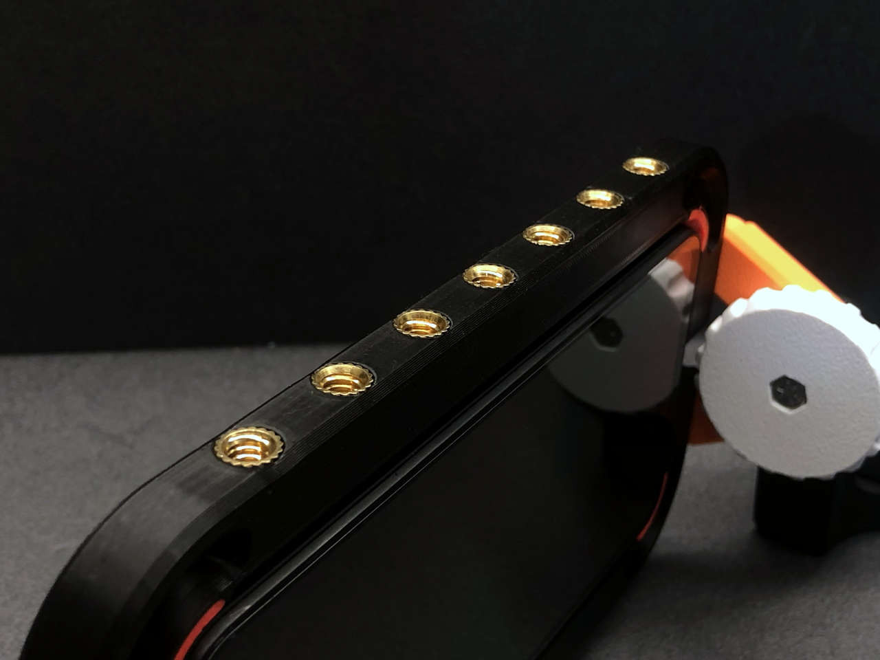 1. Lắp các Chèn ren Sau khi in xong tất cả các bộ phận, hãy bắt đầu bằng cách lắp các chèn ren vào thân giá đỡ chính: Trên các cạnh trên và dưới, lắp các chèn 1/4”-20.
