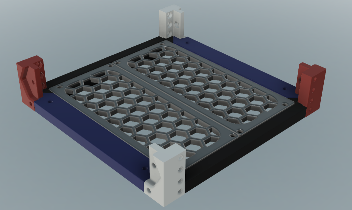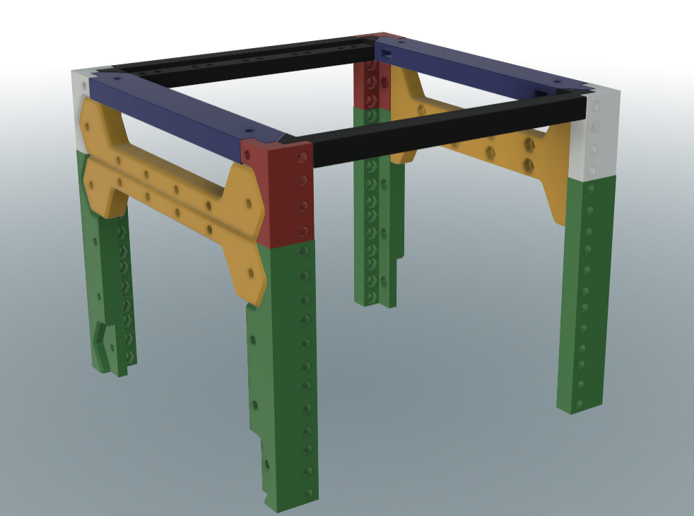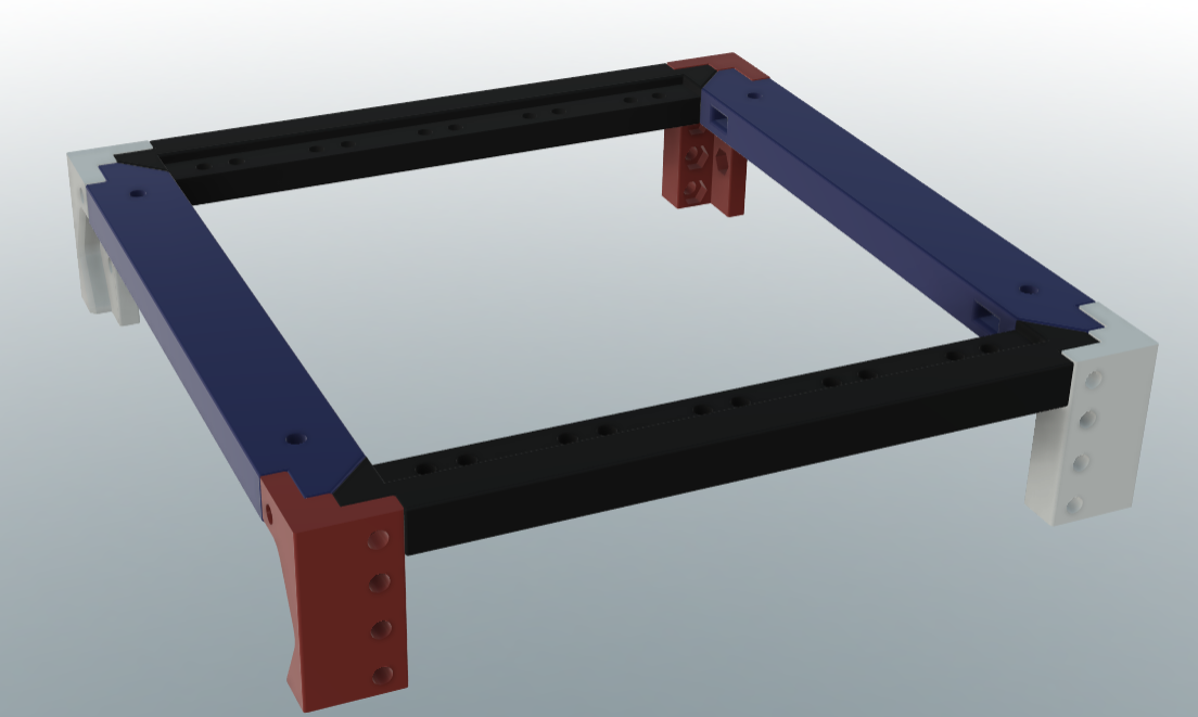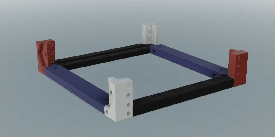 - Đặt một đai ốc vào rãnh lục giác ở mỗi đầu của 2 Giá đỡ Trước-Sau (hình màu đen) và 2 Giá đỡ cạnh (hình màu xanh dương) (rãnh được cắt trên các góc 45 độ).