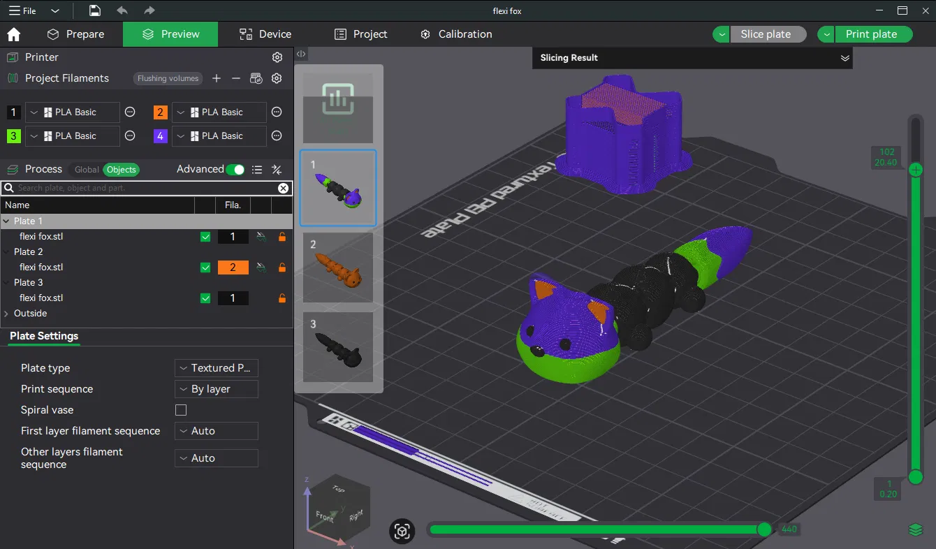 - 🎨 Flexi Fox – phiên bản nhiều màu với mũi, mắt và đuôi tách rời (cần AMS/MMU hoặc thay đổi filament)