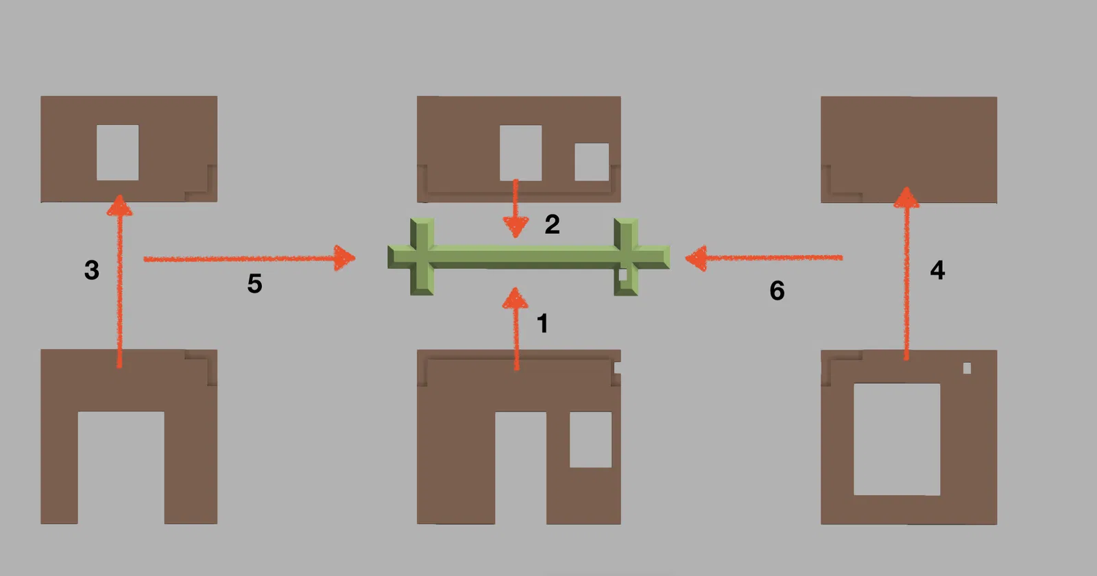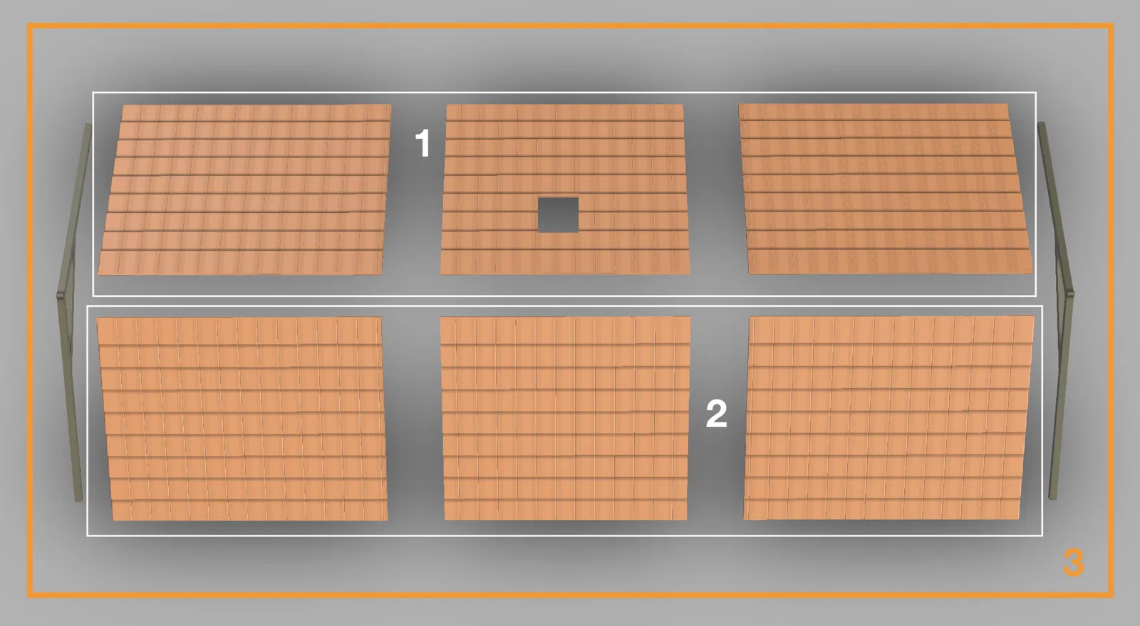 Đối với tường Bắc/Nam: (6 bộ phận cộng với thanh đỡ ngang, xem hình)