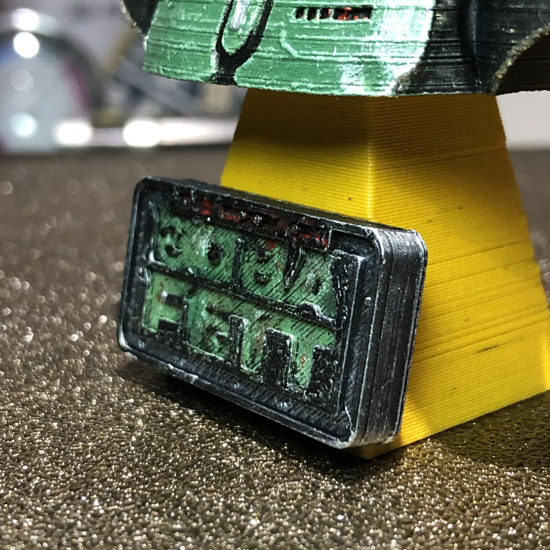 - "Book of Boba Fett LED Lamp", của Cos1969 trên Thingiverse https://www.thingiverse.com/thing:5194942 CC BY 4.0 Phần mặt trước được sử dụng để lấy hồ sơ của các chữ cái, sau đó được lấp đầy bằng các hình dạng rắn. Ảnh của OpenFigure3D, sơn thủ công bằng acrylic.