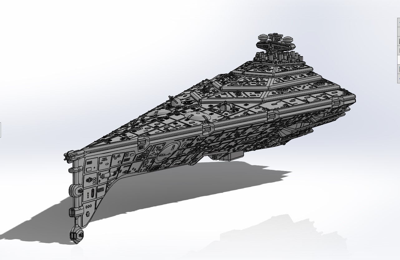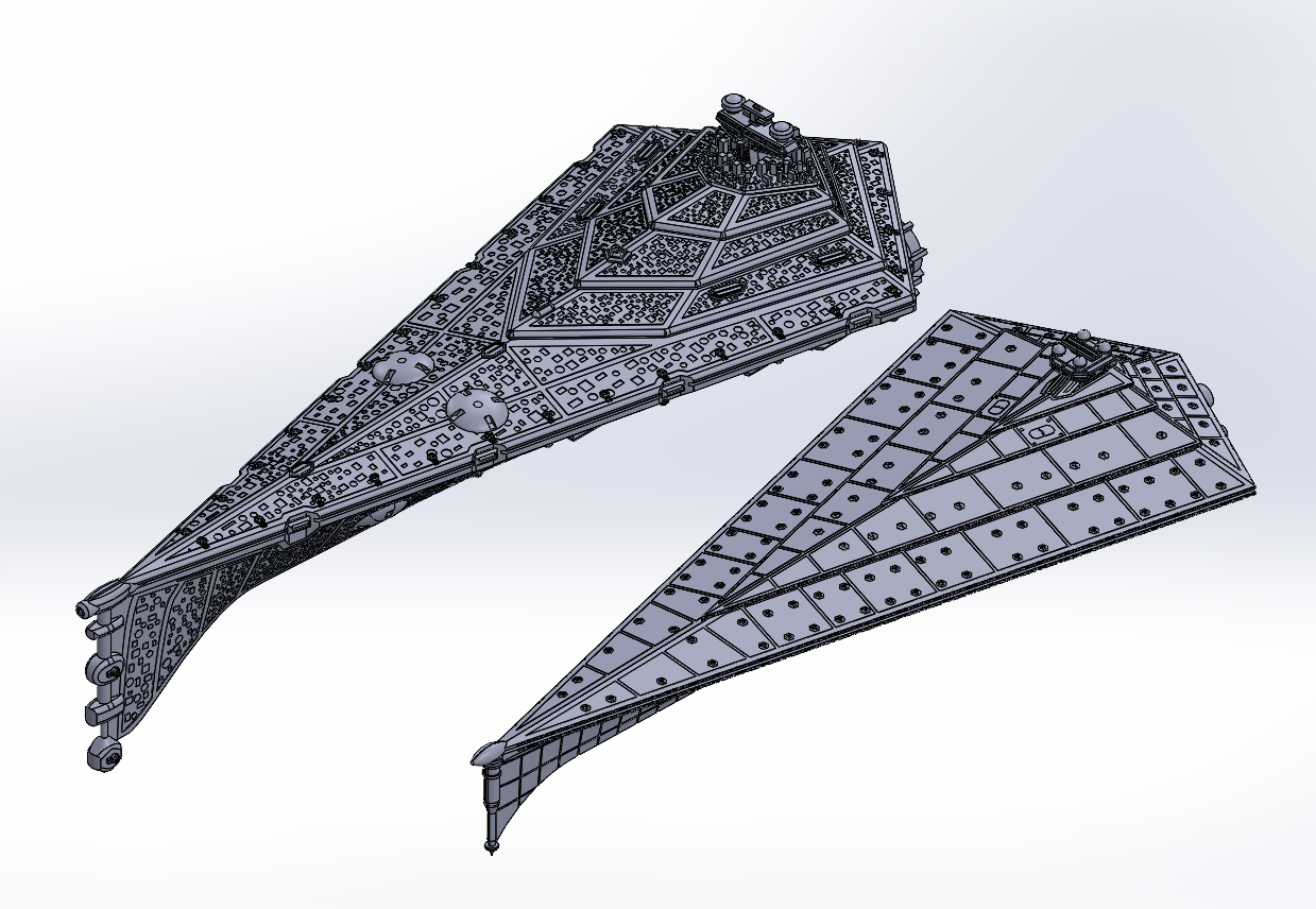Vài năm trước, tôi đã cố gắng chế tạo một Eclipse Star Destroyer như trong cuốn sách cũ “Essential guide to vehicles and vessels”. Thật thú vị và tôi hài lòng với kết quả. Kỹ năng của tôi đã tiến bộ đáng kể, và một vài người bạn tốt đã gợi ý những cải tiến có thể thực hiện. Vì vậy, tôi quyết định thử lại. Hơn 30 giờ sau, đây là thành quả. Một phiên bản thu nhỏ được bao gồm vì tôi phát hiện ra rằng phiên bản cuối cùng sẽ không vừa với khổ in Ender 3 của tôi. Một phiên bản chia nhỏ được bao gồm, cũng như một phiên bản có kết nối chân đế kiểu Armada. Bao gồm trong hình ảnh là so sánh hai phiên bản, trong đó tệp SolidWorks ban đầu đã bị mất, đó là một phần động lực của dự án này. Chúc các bạn vui vẻ. [Cập nhật:] Bao gồm các tệp -a là một cấu hình in khác với nhiều phần hơn. Đó là một thử nghiệm để xem liệu tôi có thể đạt được kết quả in tốt hơn không.