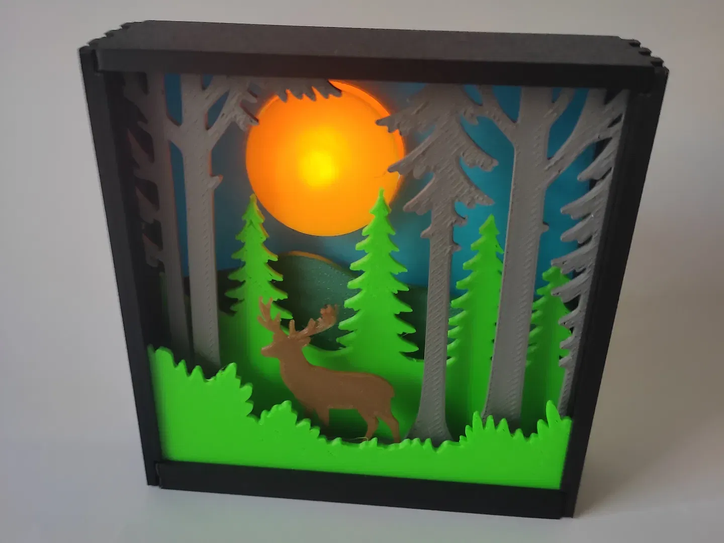 Tái hiện khung cảnh rừng cây thanh bình lúc hoàng hôn bằng hộp bóng đổ 3D. Có chú hươu, cây cối và đèn LED tealight tạo hiệu ứng ánh sáng ấm áp. Dễ in, không cần đi dây.