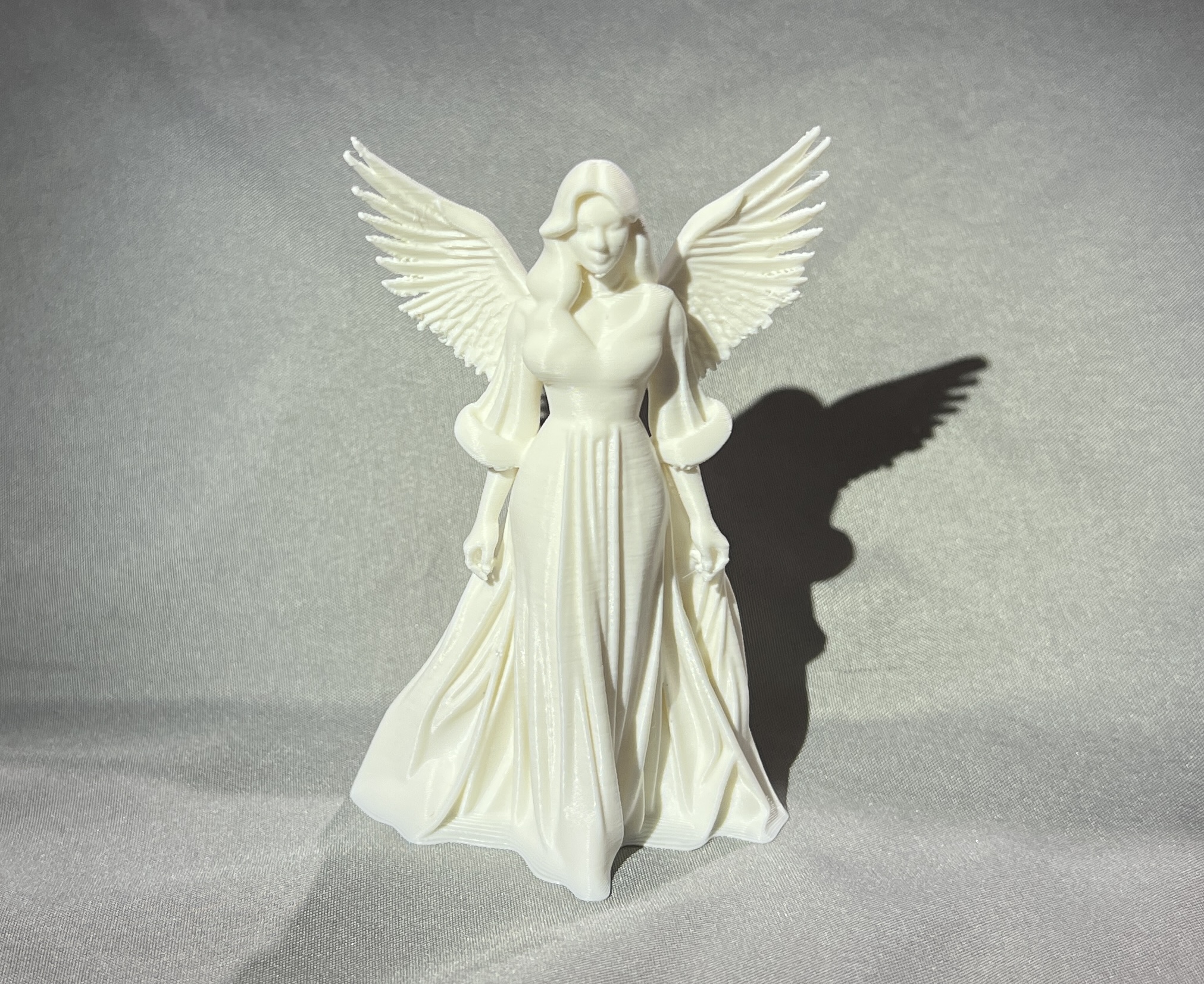 Đây là một tác phẩm điêu khắc đầy chất thơ và thiêng liêng, thể hiện hình ảnh một thiên thần trong bộ váy cưới. Nàng hơi cúi đầu, đôi cánh nhẹ nhàng dang rộng, như đang giáng từ trời mây xuống trần gian, mang theo phước lành và hy vọng cho thế giới. Những nếp gấp của chiếc váy cưới buông lơi tự nhiên như dòng nước, tôn lên dáng vẻ thanh thoát của thiên thần. Tổng thể vừa uy nghiêm vừa dịu dàng, tượng trưng cho sức mạnh của tình yêu và sự che chở.