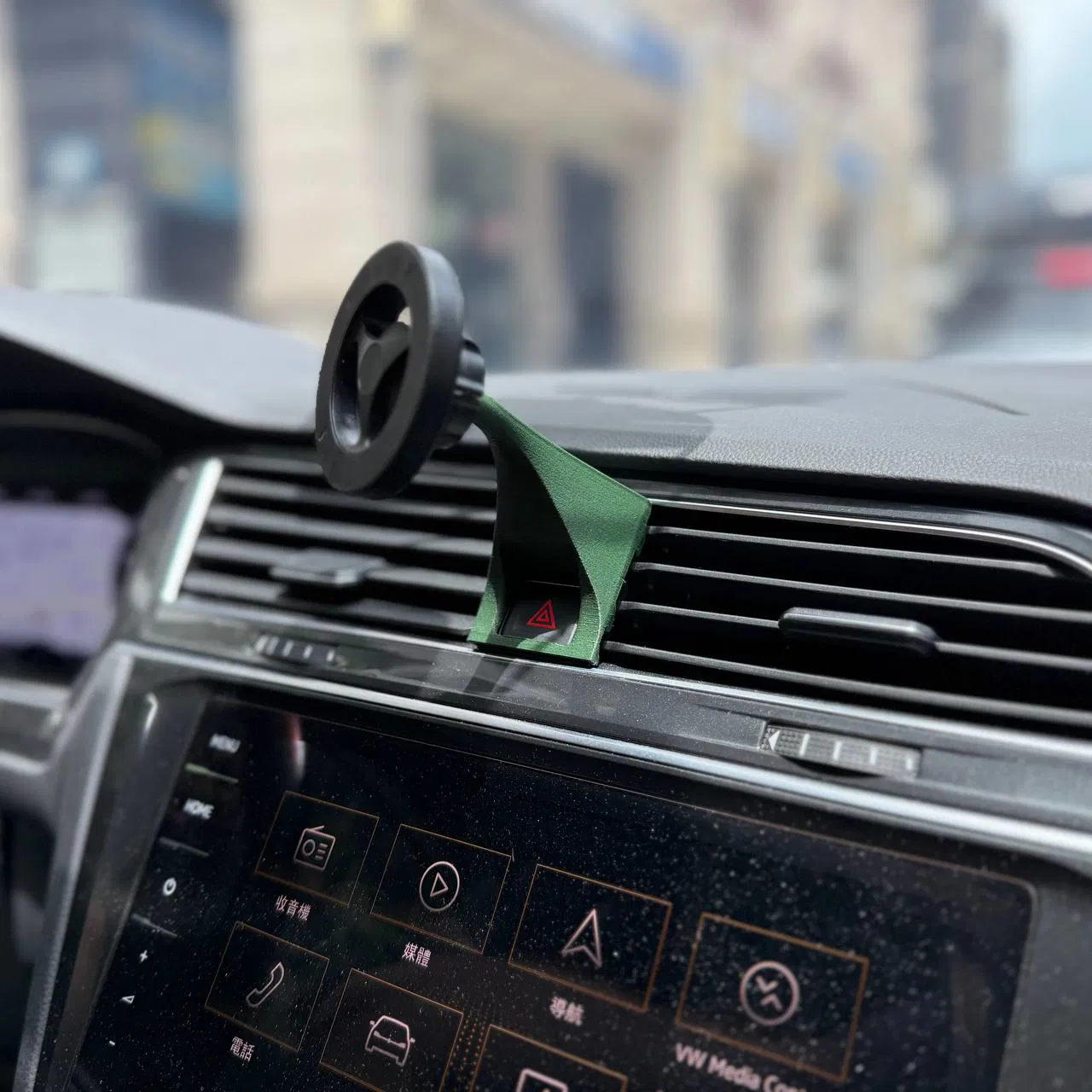 Giá đỡ điện thoại dạng đế bi cải tiến cho VW Tiguan 2. Phiên bản V2 này in dễ hơn, chống trượt tốt hơn và dễ dàng thao tác với công tắc đèn khẩn cấp. Khuyến khích dùng vật liệu chịu nhiệt như PETG/ABS hoặc resin.