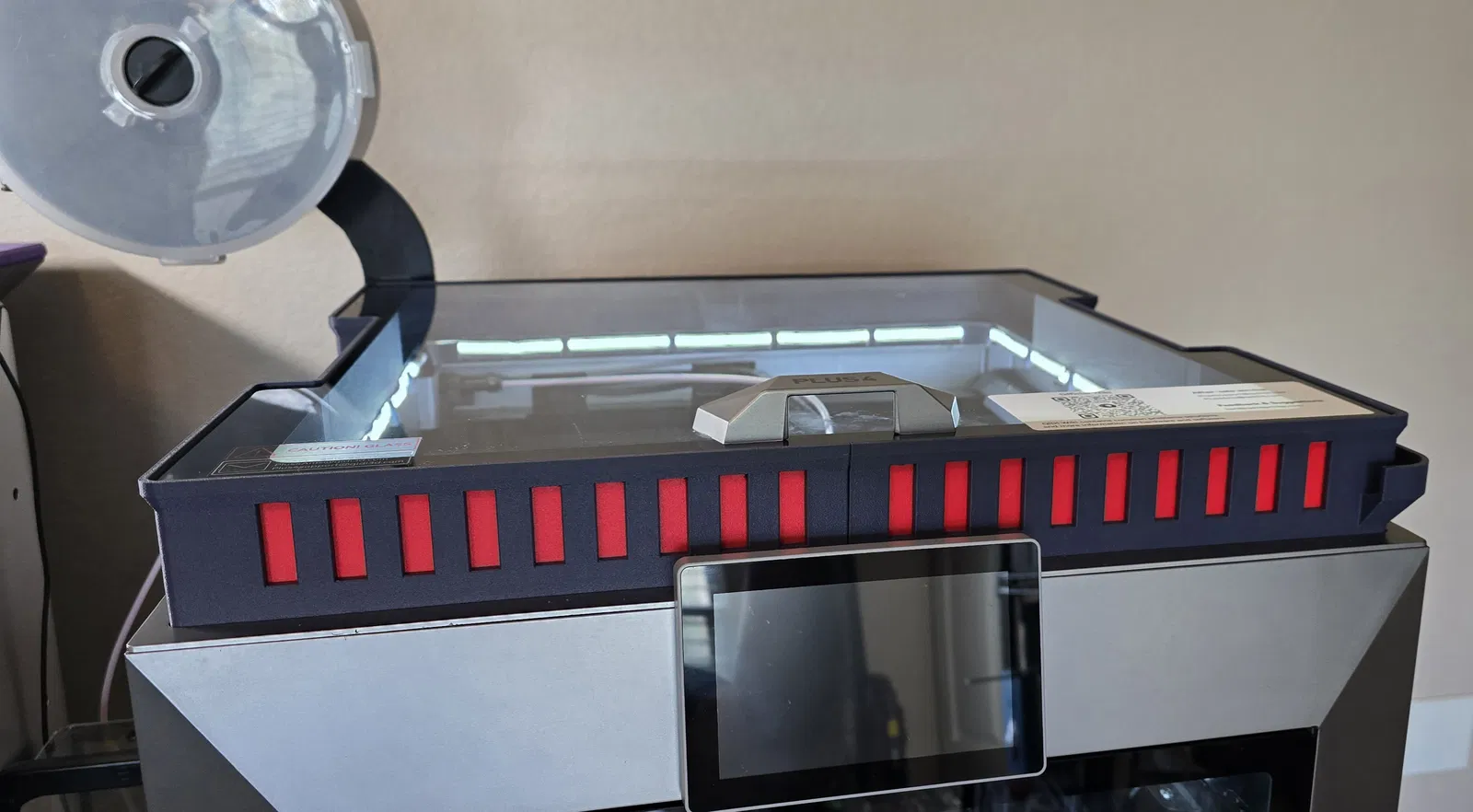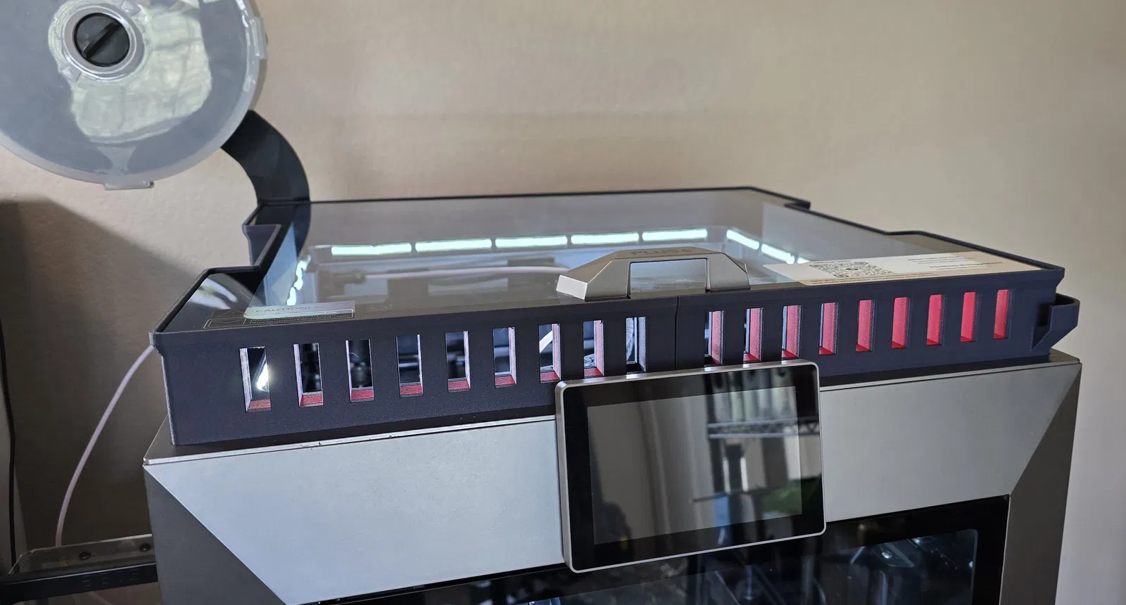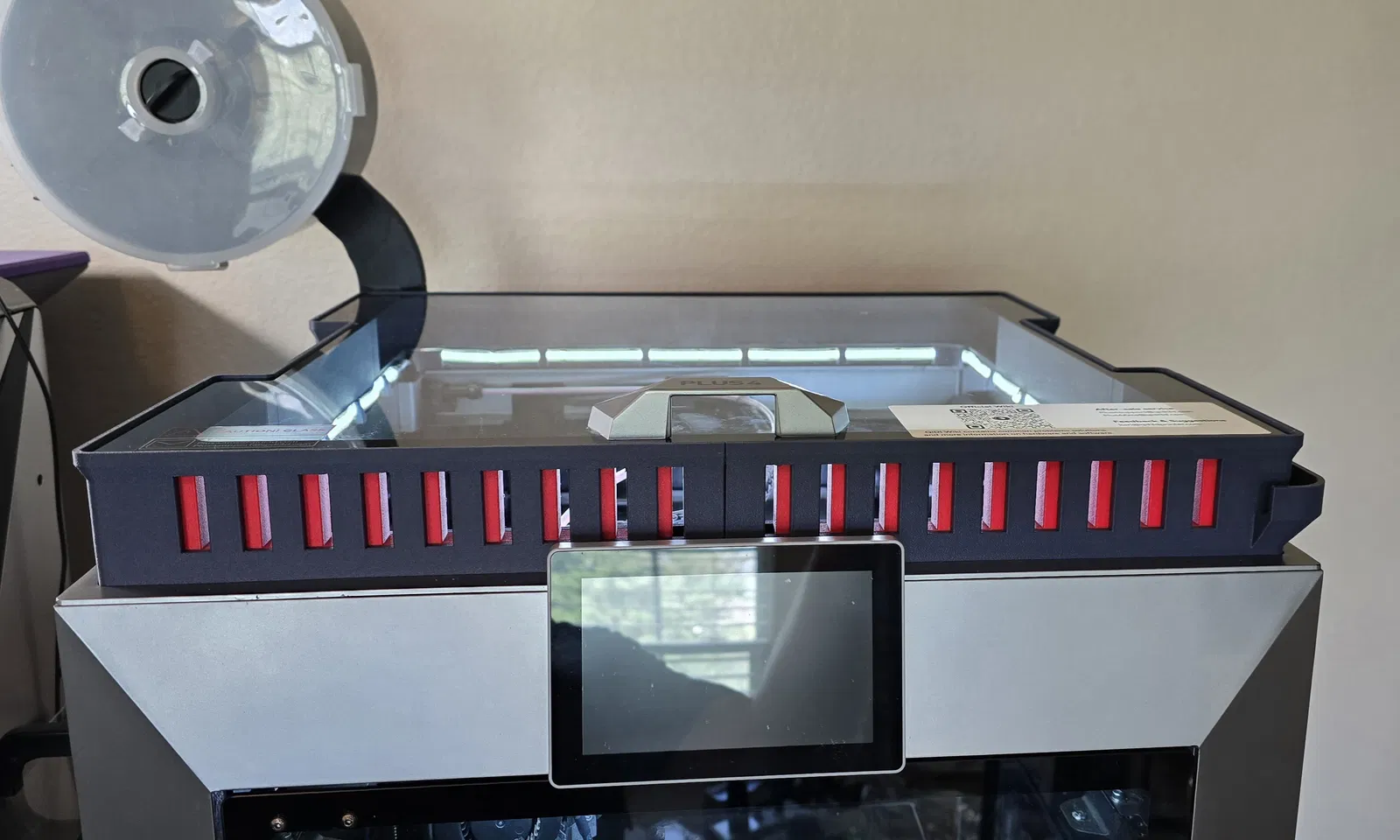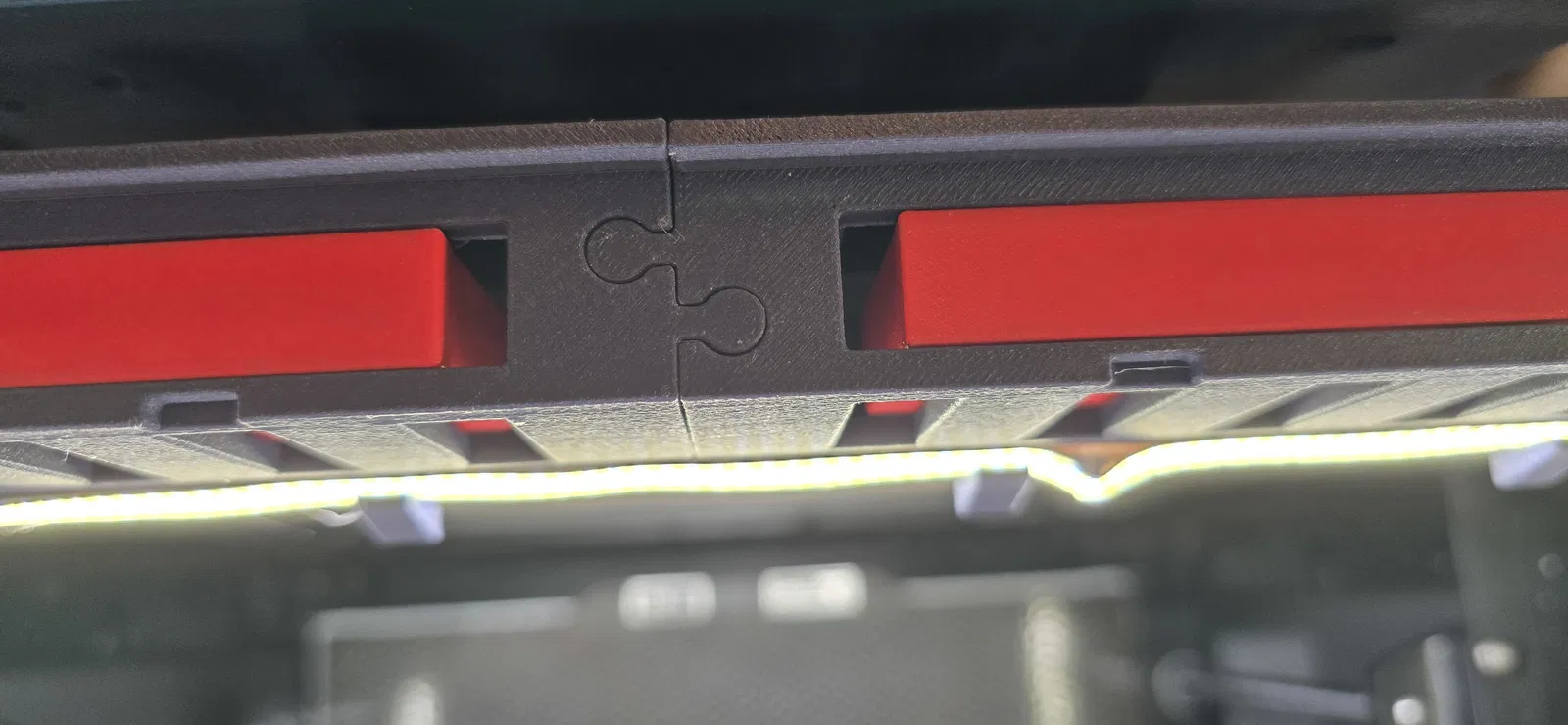 Các kẹp cho dải đèn đã được gia cố và có khoảng cách chính xác và đồng đều hơn để có vẻ ngoài đồng nhất hơn. Đường viền bên trong của khu vực gắn dải đèn đã được điều chỉnh để vừa vặn chính xác với đường viền bên trong của bộ phận gắn nắp của Plus4, sao cho ánh sáng từ dải đèn không còn bị chặn bởi các bộ phận hỗ trợ bên trong của Qidi Plus4.