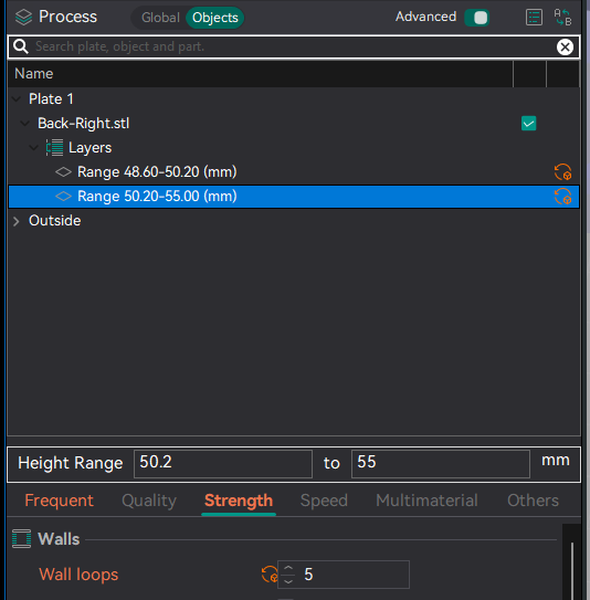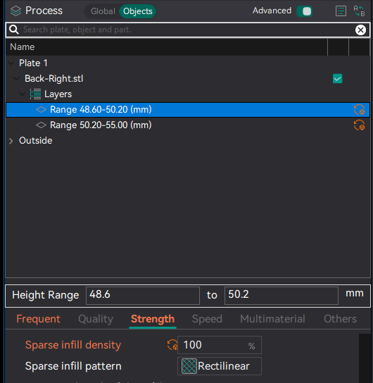 Việc chỉ định thủ công hai bộ sửa đổi phạm vi chiều cao ở 48,6-50,2mm với mật độ ruột 100% rectilinear, và bộ sửa đổi thứ hai ở 50,2-55mm với số lượng lớp vỏ đặt thành 5 cũng có thể hữu ích. Làm như vậy sẽ đảm bảo độ bám dính mạnh nhất của "viền" tấm kính với phần còn lại của vật thể nâng đỡ để chống lại các va đập từ tấm kính được đặt mạnh vào bộ phận nâng đỡ.