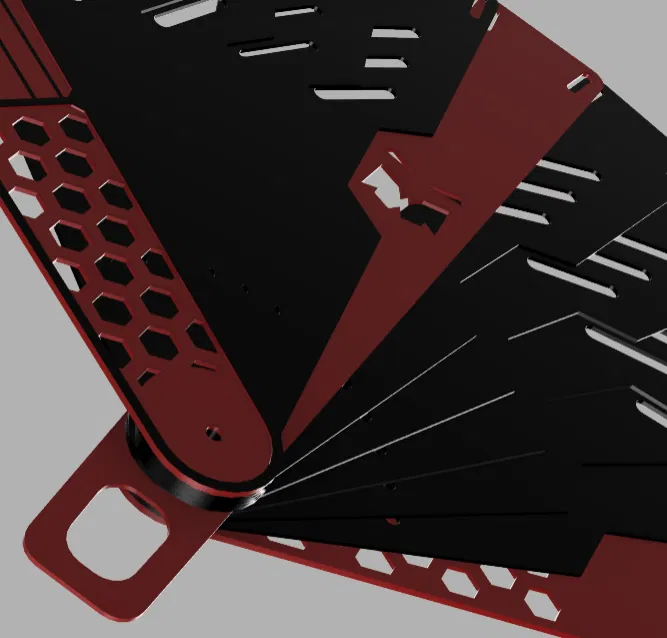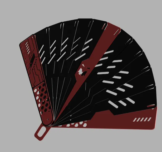 quạt gấp kiểu tương lai, thiết kế hiện đại với cánh quạt xen kẽ đỏ và đen. Nó có các lỗ đục lỗ tinh xảo trên mỗi cánh để tăng luồng khí hoặc làm đẹp, cùng khớp nối xoay được gia cố đảm bảo bung ra mượt mà. Sự kết hợp giữa hình thức và chức năng cho thấy nó có thể phục vụ cả mục đích sử dụng thực tế và tạo điểm nhấn thị giác—có thể dùng trong cosplay, thời trang công nghệ, hoặc nghệ thuật biểu diễn hiện đại.