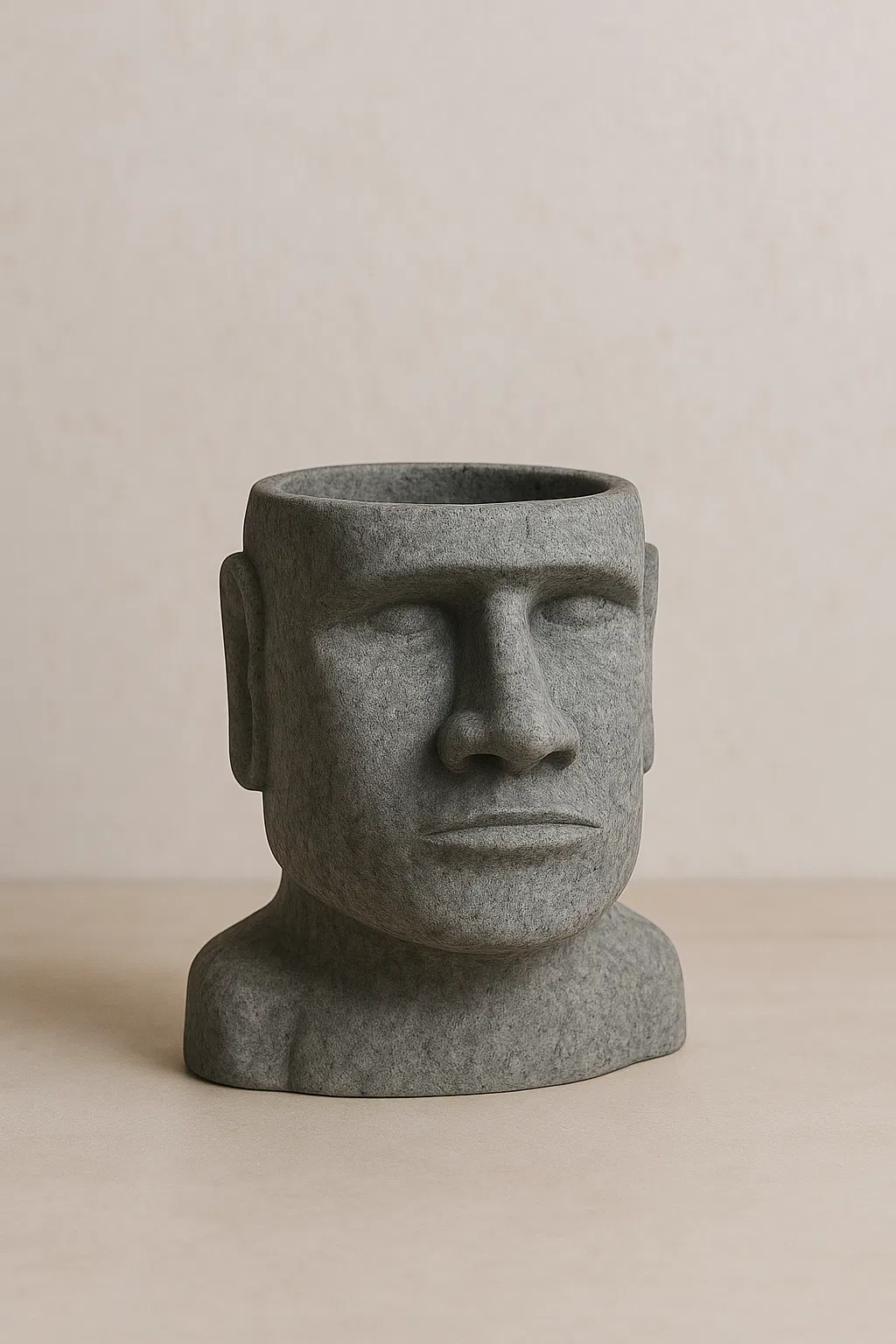 Chậu cây hình đầu Moai lấy cảm hứng từ các bức tượng Đảo Phục Sinh nổi tiếng, mang đến một phong cách độc đáo cho không gian của bạn. Thiết kế nguyên khối với phần rỗng bên trên lý tưởng để trồng cây mọng nước hoặc đựng bút, tạo điểm nhấn trang trí ấn tượng trên bàn làm việc hay kệ sách.