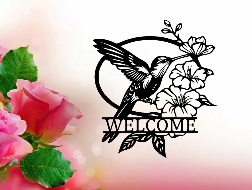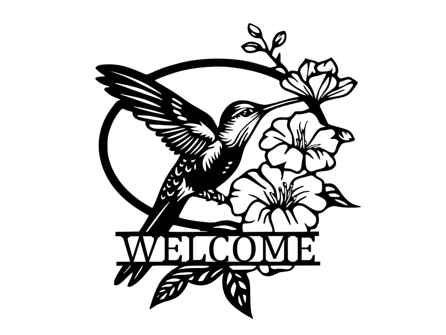 Mang chút nét duyên dáng, thanh lịch vào không gian của bạn với bức tranh treo tường hình chim ruồi được thiết kế tinh xảo này. Mô hình này nổi bật với hình bóng chi tiết của một chú chim ruồi đang hút mật từ những bông hoa đang nở rộ, tất cả được bao quanh bởi những đường cong mềm mại và các yếu tố thiên nhiên. Dòng chữ "WELCOME" lớn thêm một thông điệp ấm áp và chào đón, làm cho nó trở nên lý tưởng cho cửa ra vào, sân hiên hoặc lối vào nhà.